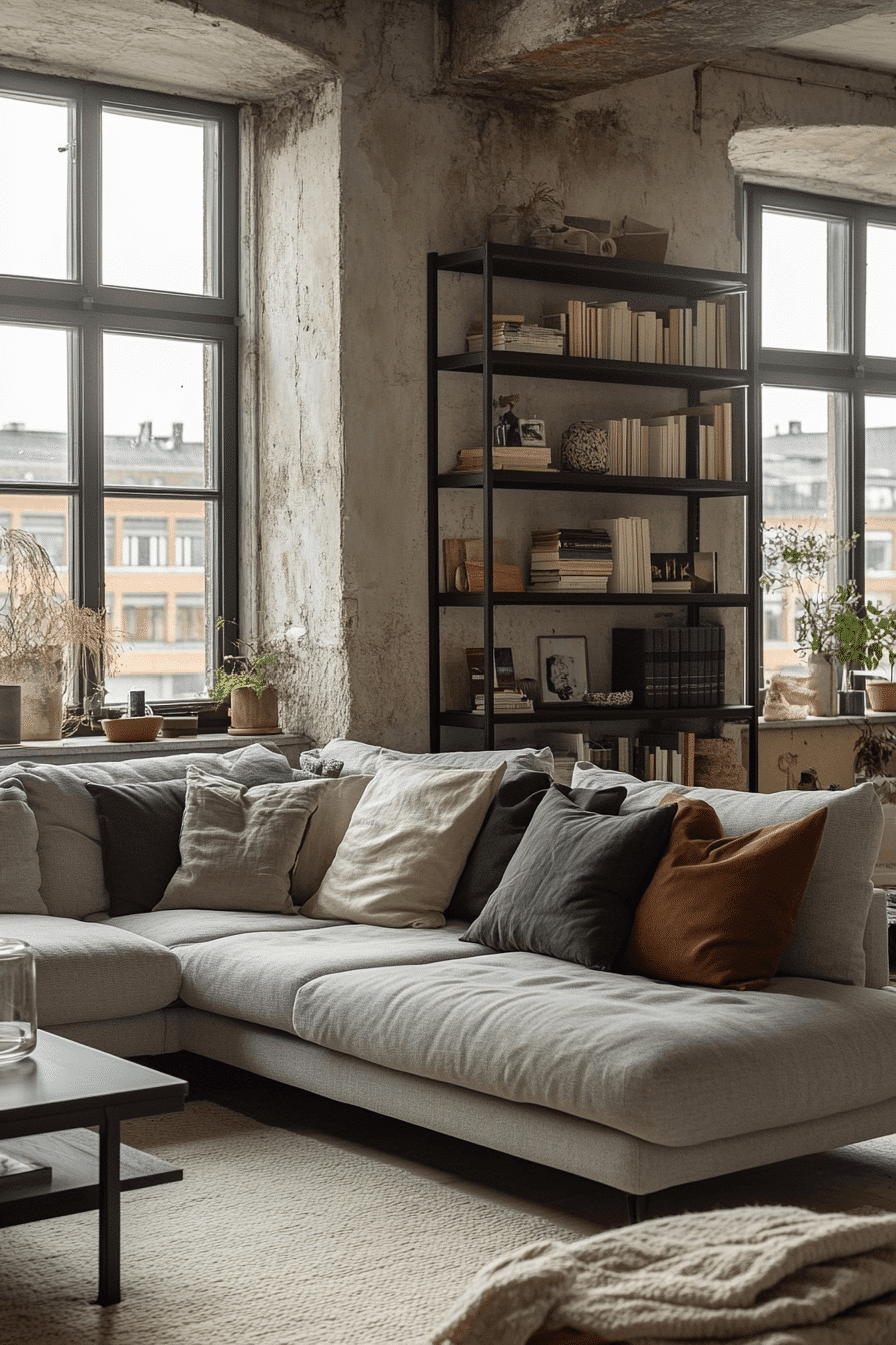 A neutral color palette makes an industrial living room feel calm and balanced while keeping its rugged roots. Shades of gray, beige, and taupe create a soothing backdrop. Black steel and concrete elements add depth without overpowering the space. Soft textiles and simple artwork bring warmth to the room. This design is perfect for those who want a minimalist approach to industrial style. Click here to uncover neutral industrial haven ideas.