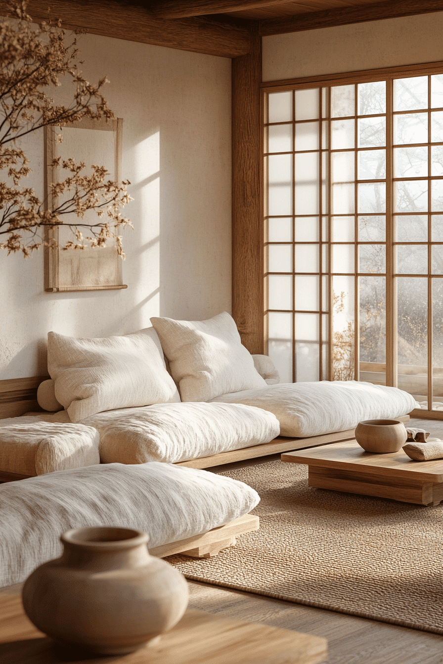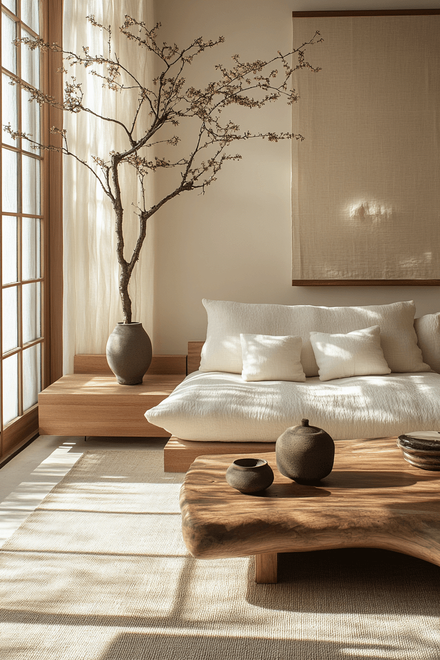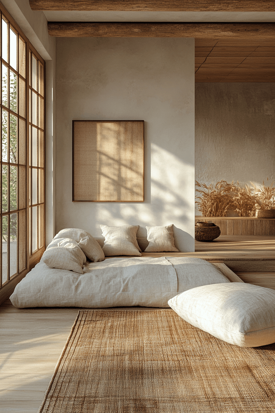 Neutral zen japandi interiors transform your home into a peaceful retreat with soothing palettes and natural materials. Light wooden furniture pairs with soft linen curtains and textured rugs for warmth. Clean lines keep the room airy and clutter-free, making it visually calming. Large windows invite natural sunlight, enhancing the serene ambiance. The entire space radiates balance, comfort, and tranquility. Click to see more neutral zen retreat ideas.