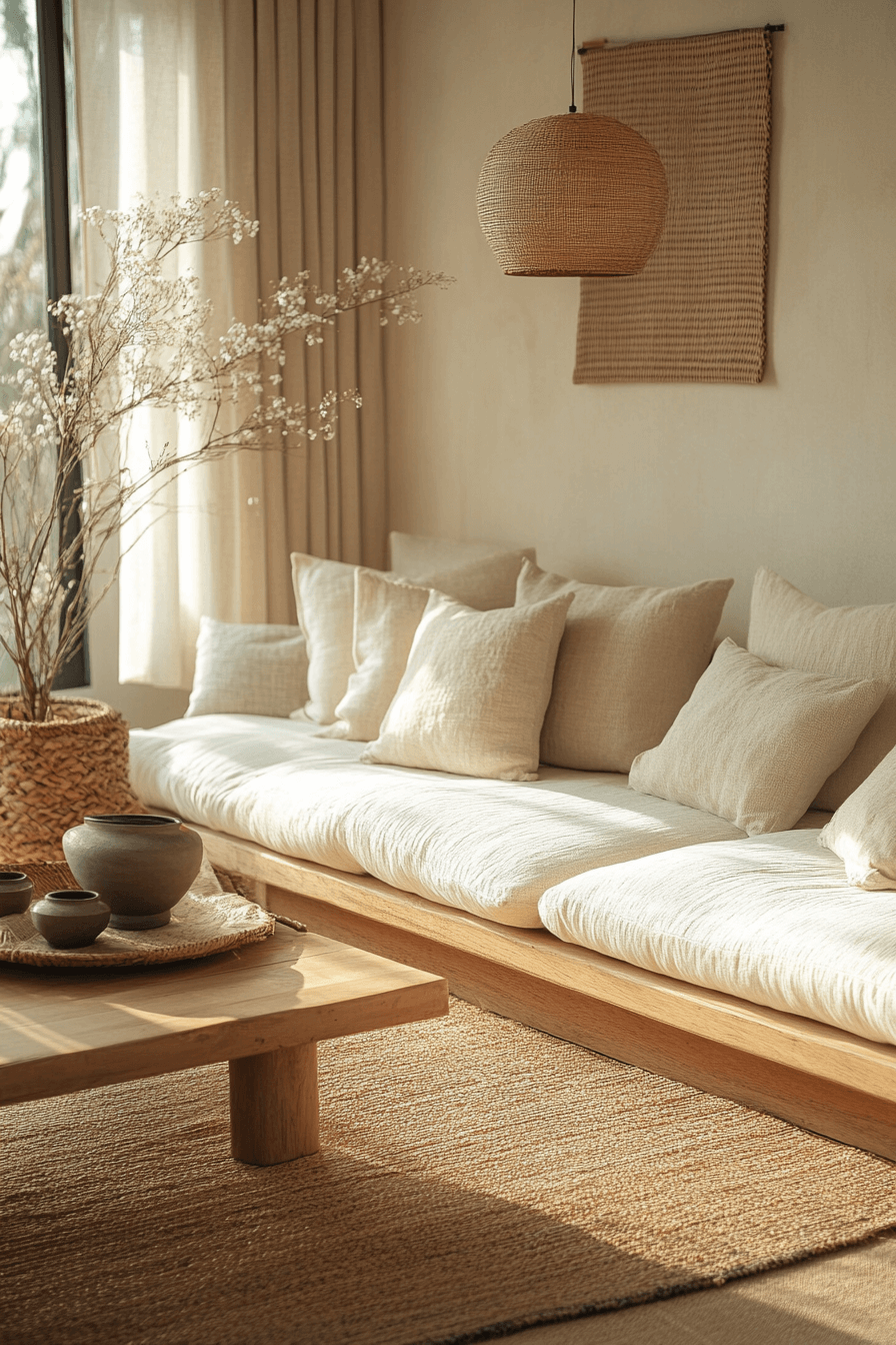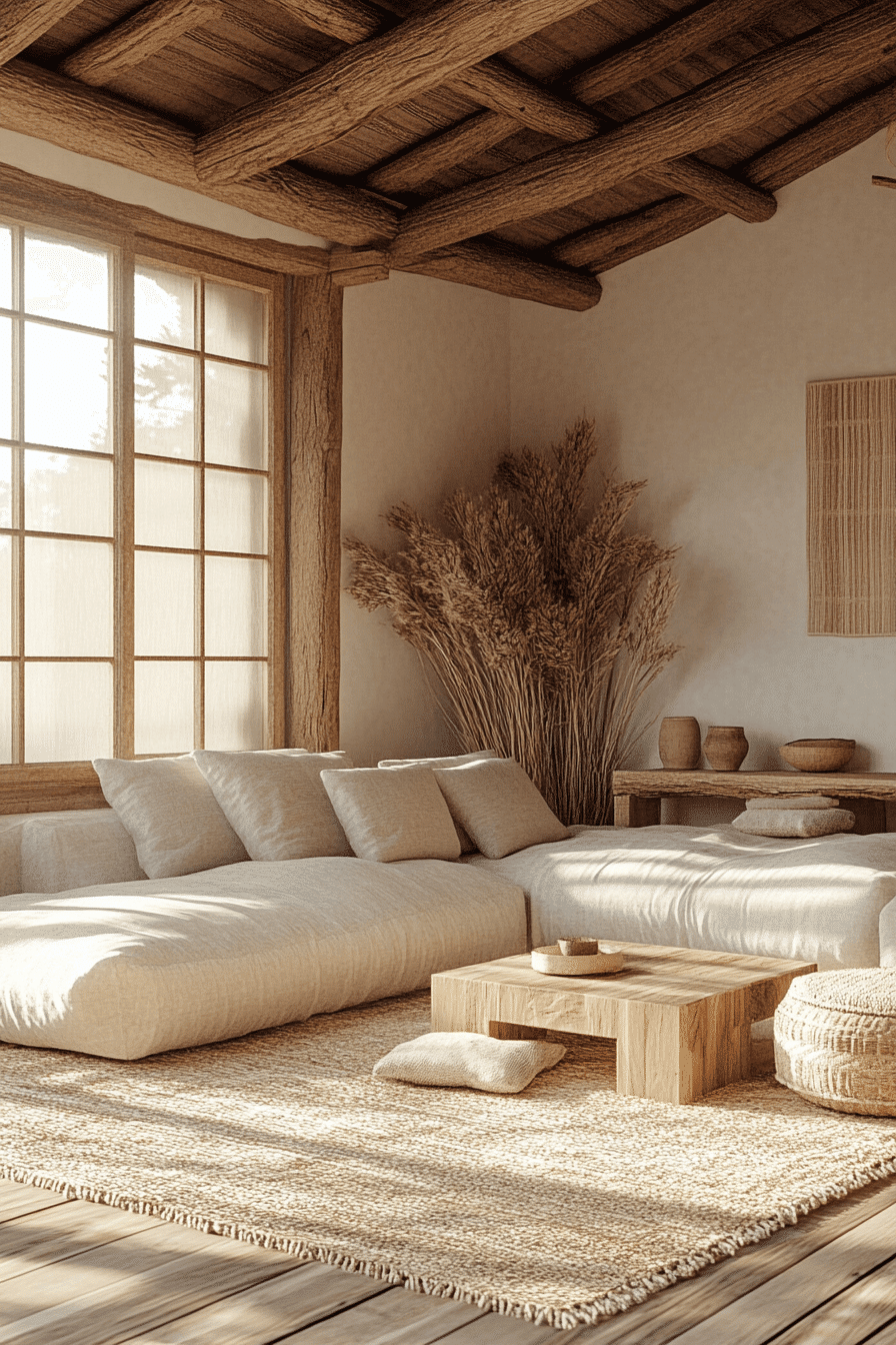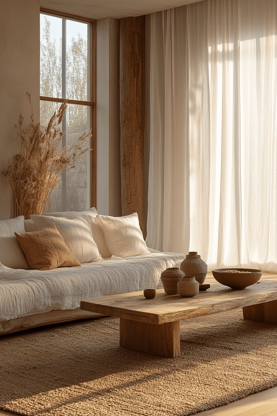 Neutral zen japandi interiors transform your home into a peaceful retreat with soothing palettes and natural materials. Light wooden furniture pairs with soft linen curtains and textured rugs for warmth. Clean lines keep the room airy and clutter-free, making it visually calming. Large windows invite natural sunlight, enhancing the serene ambiance. The entire space radiates balance, comfort, and tranquility. Click to see more neutral zen retreat ideas.