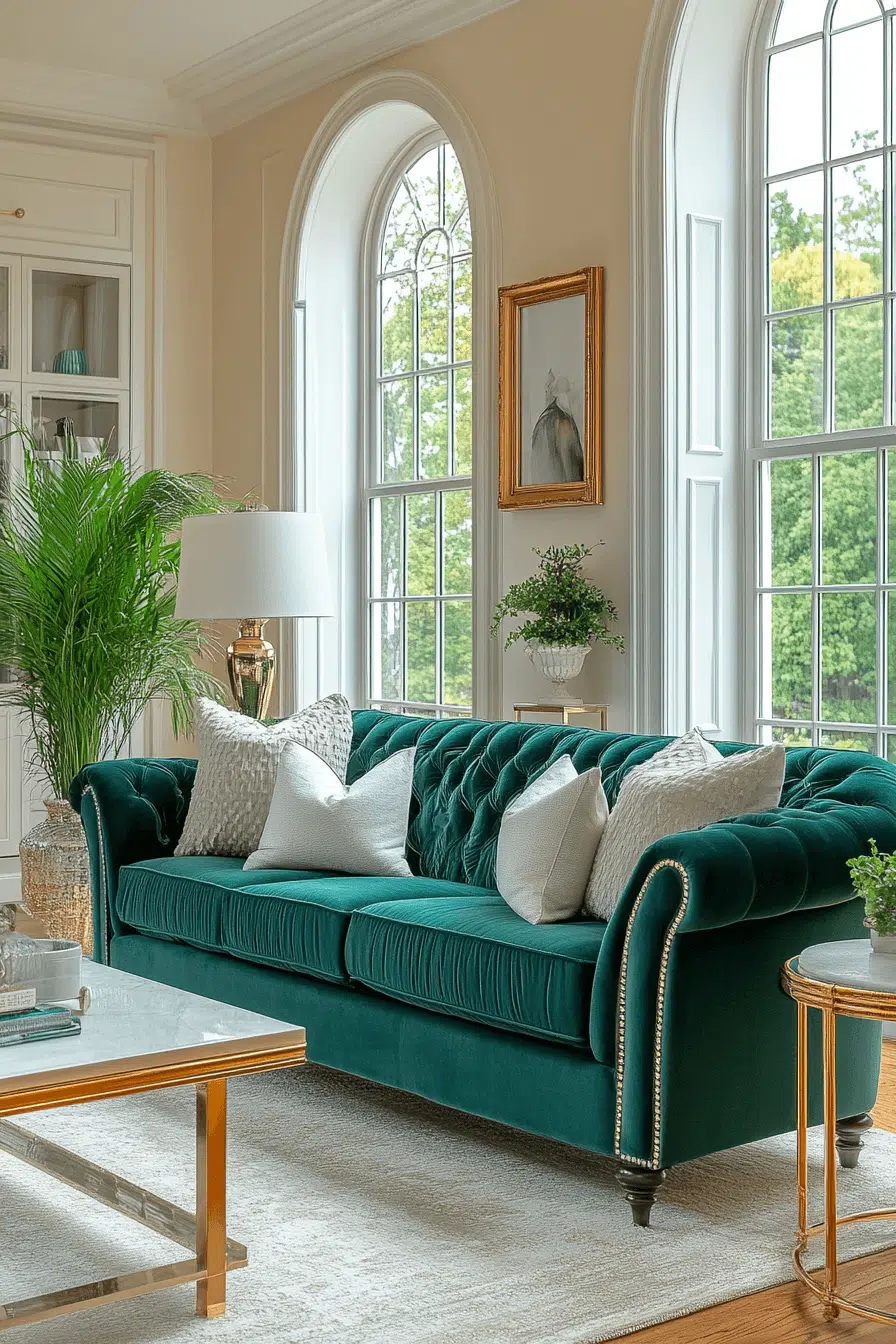 A jewel tone living room with velvet accents creates an inviting yet luxurious atmosphere. Deep emerald or sapphire velvet sofas provide rich texture while instantly elevating the design. Pairing them with neutral walls allows the colors to stand out without overwhelming the space. Gold or brass light fixtures add warmth and complement the jewel tones beautifully. Soft area rugs in coordinating hues pull the whole look together.