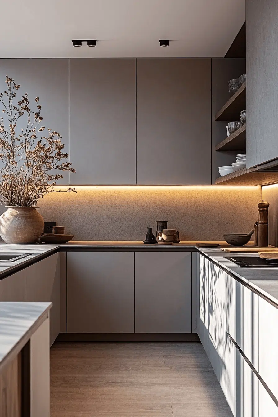 Modern matte light grey kitchen cabinets provide a sophisticated, understated look that’s perfect for contemporary interiors. The matte finish absorbs light, reducing glare and giving the cabinets a soft, tactile feel. These cabinets often feature minimalistic hardware and flat surfaces, emphasizing a sleek, modern aesthetic. The light grey color complements a wide range of countertop materials and wall colors.