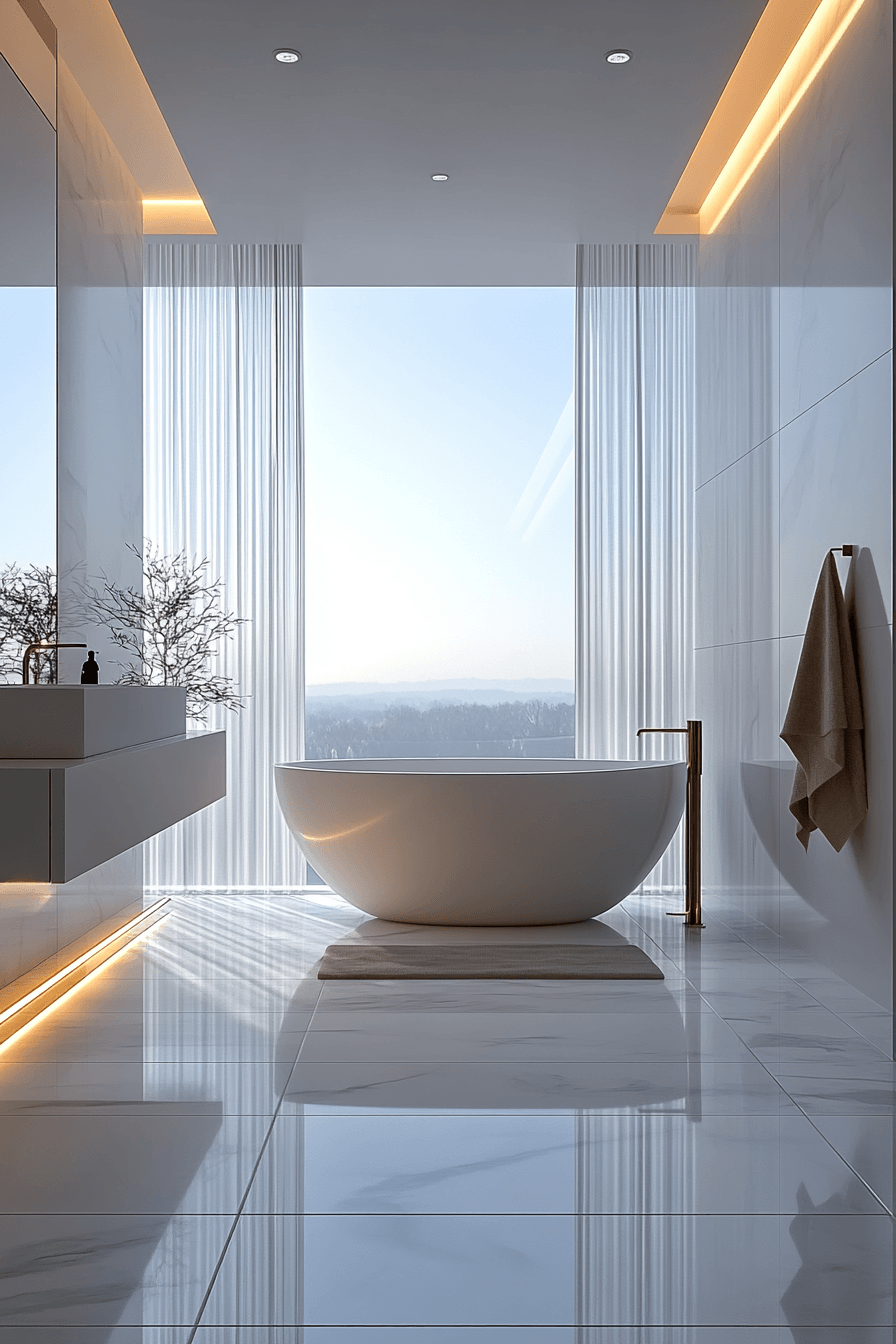 An ultra-light palette creates a cloudlike feeling in a minimalist bathroom. Shades of white, ivory, pale beige, and soft taupe reflect natural light with elegance. These tones make the space feel bigger and more breathable. Minimalist furnishings in matching tones blend into the background. The result is soothing, effortless simplicity. Discover how ultra-light color schemes elevate minimalist bathrooms here.