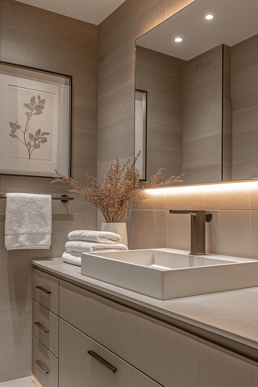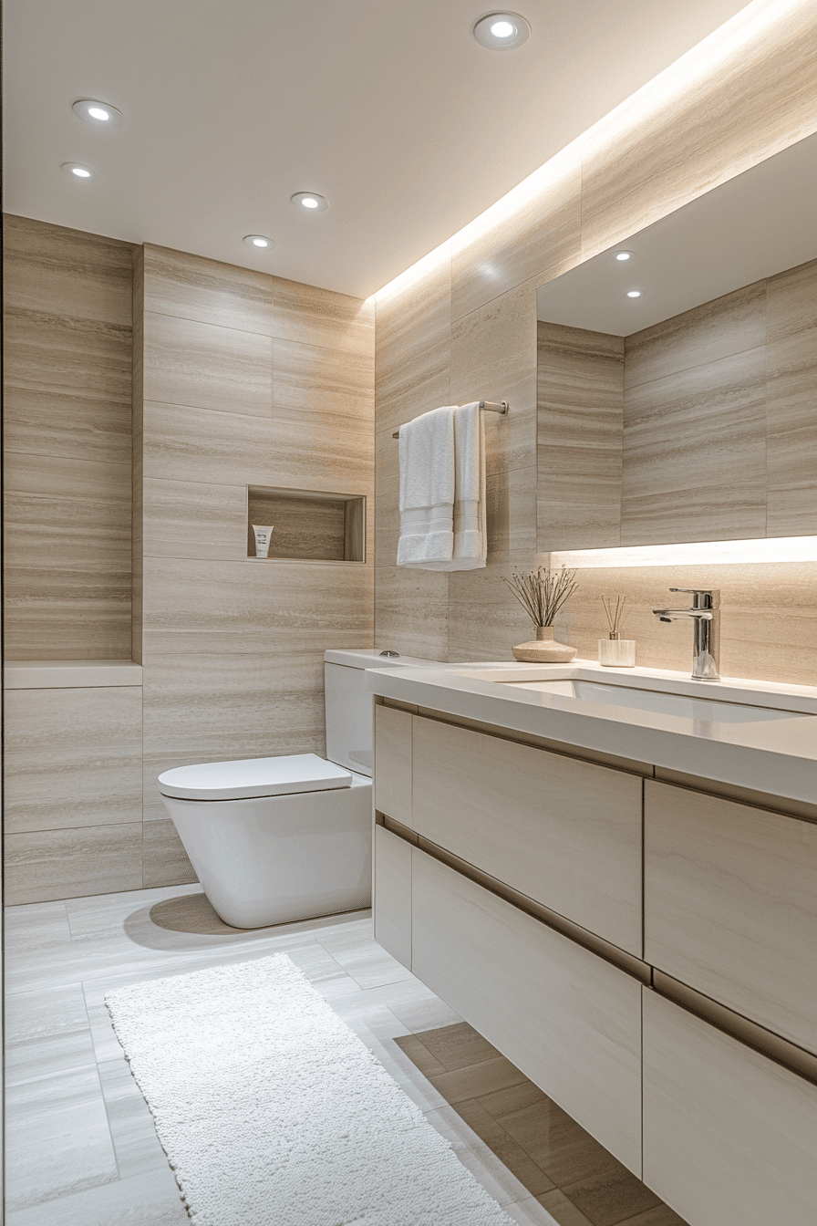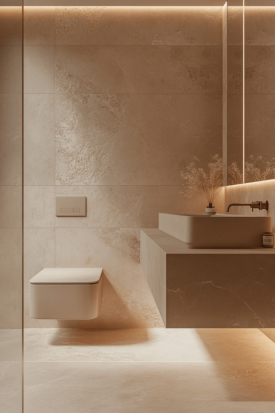 A soft beige palette brings warmth to a minimalist bathroom without overwhelming the senses. Beige tones in tile, walls, or cabinetry create a cozy yet restrained environment. When paired with simple shapes and matte finishes, the look stays sleek. The color softens hard lines while maintaining a neutral identity. It’s ideal for anyone who wants minimalism with a gentle touch. Explore soft beige bathrooms that redefine modern simplicity.