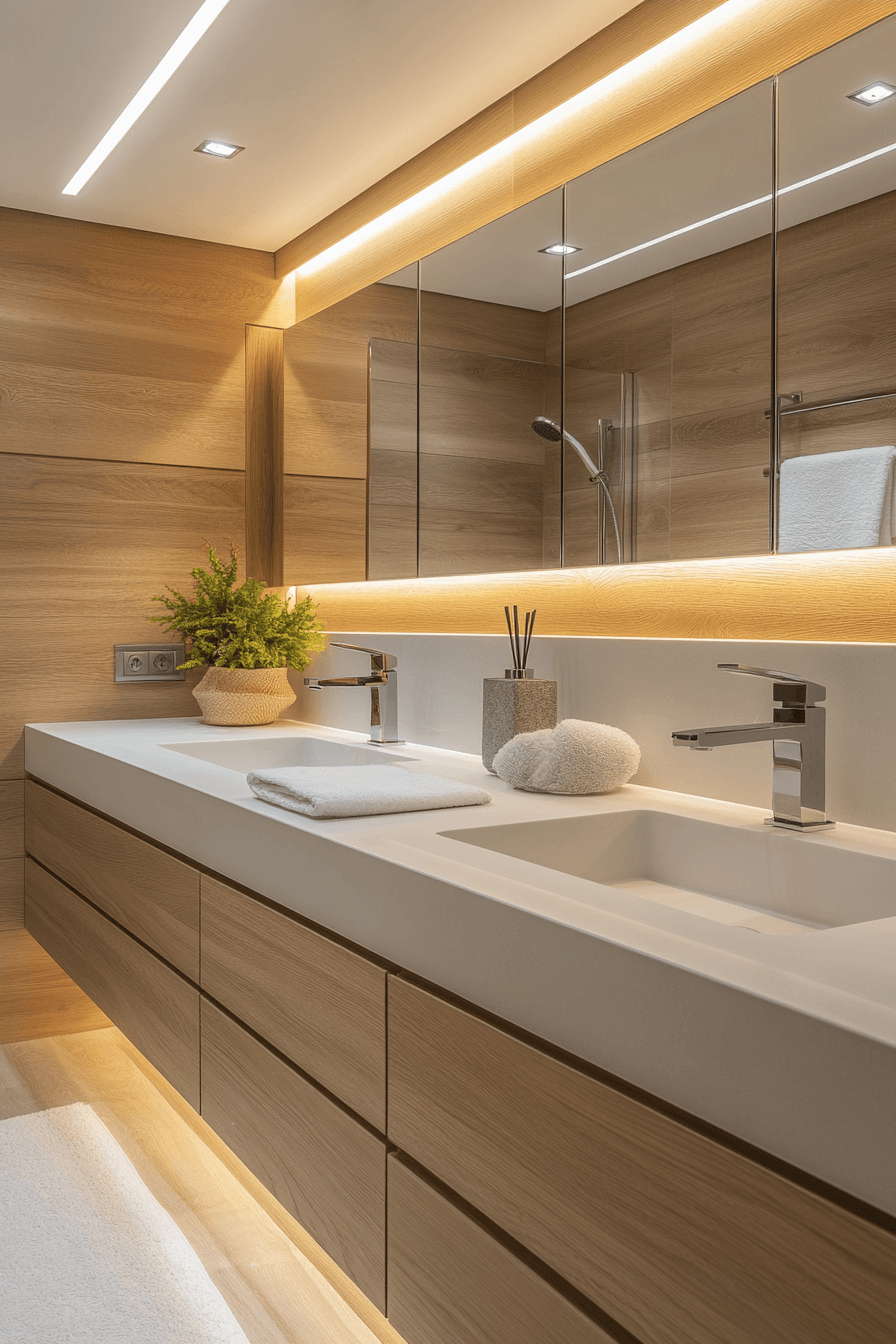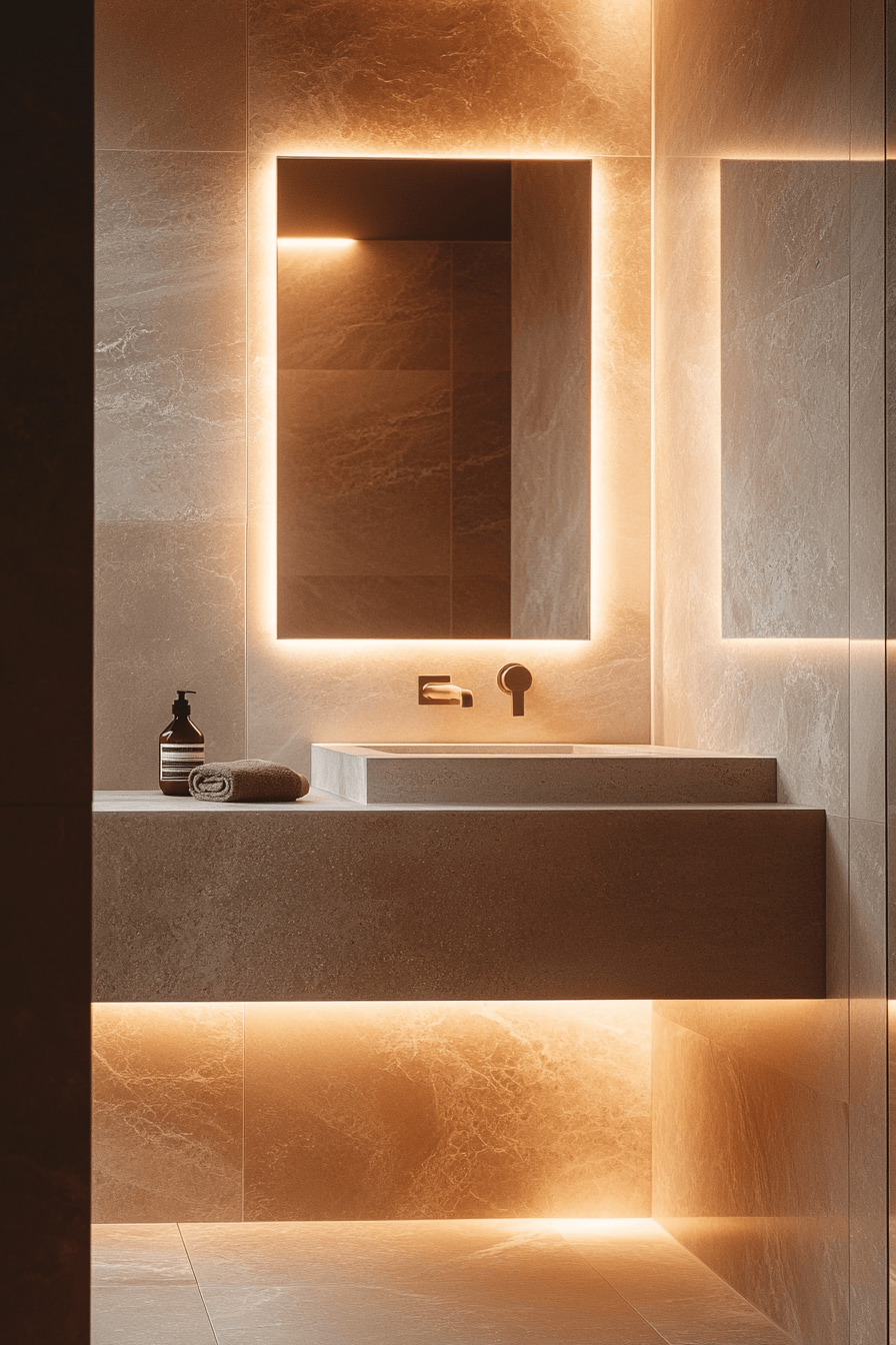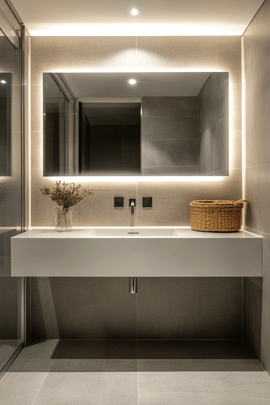 A backlit floating mirror adds ambient glow and modern precision to a minimalist bathroom. The light creates depth while eliminating the need for separate lighting fixtures. The mirror appears to hover, adding sophistication without bulk. This minimalist feature enhances both form and function. Clean lines and soft lighting make every morning feel refined. Click now to explore stunning backlit mirror ideas.