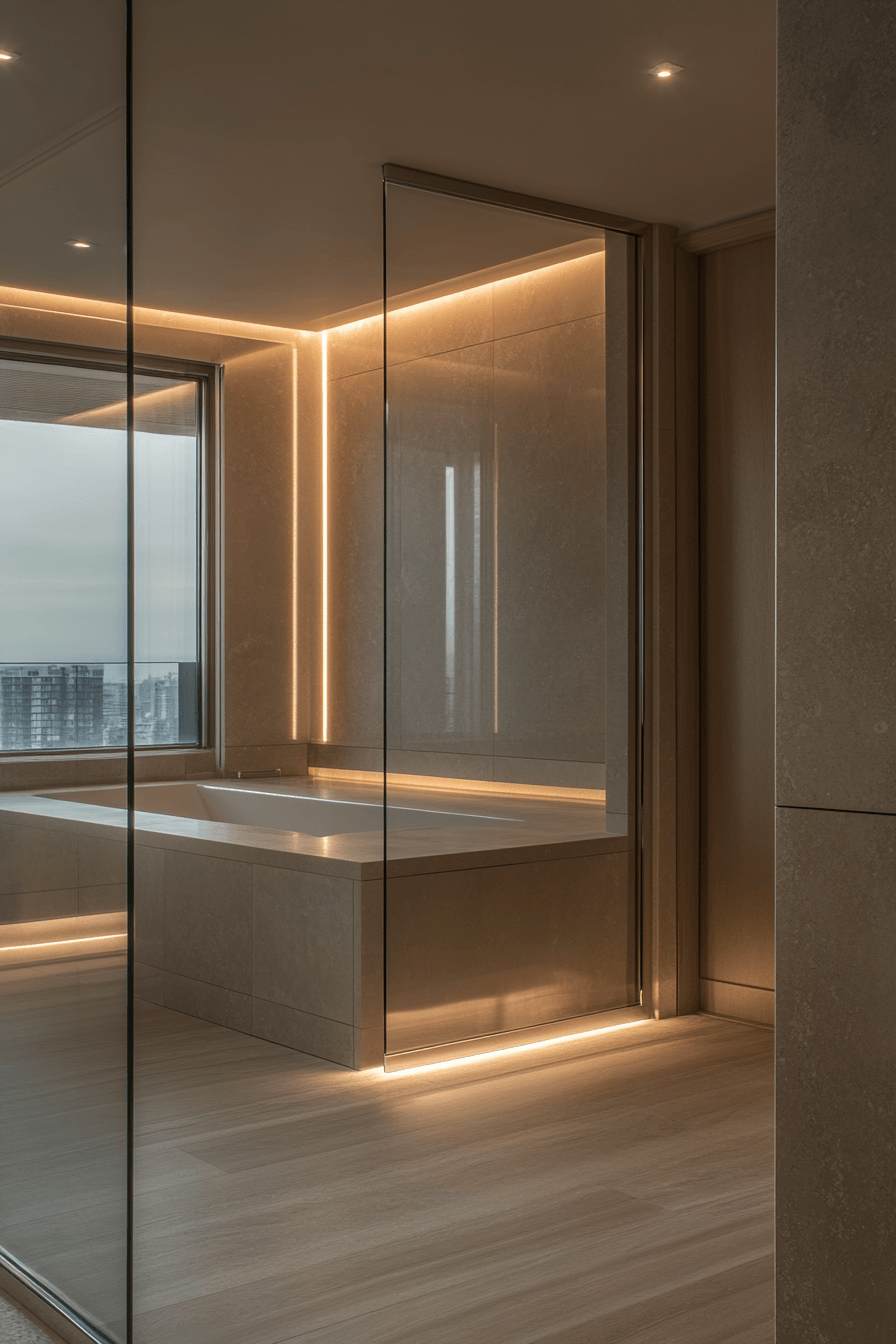 A glass partition in a minimalist bathroom separates wet and dry areas without interrupting space. Frameless or black-trimmed panels add transparency and order. The open feel supports the flow and brightness of the room. Minimal hardware and floor-to-ceiling installation make the design feel intentional. It’s an elegant way to maintain zoning while embracing openness. Explore layouts that use glass partitions for minimalist effect.