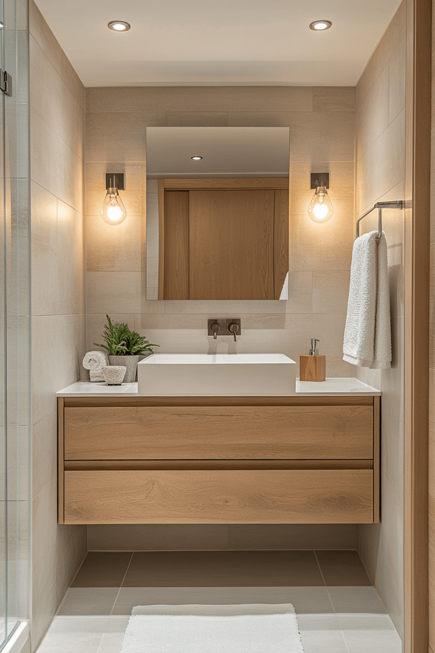 Light wood accents bring gentle warmth to minimalist bathrooms while maintaining clarity. Think floating oak vanities or beech wood towel ladders in soft matte finishes. These touches add texture without disrupting the neutral palette. Light wood pairs well with white and grey, supporting a Scandinavian-inspired feel. It’s a great way to soften a strictly modern look. Tap here to explore minimalist bathrooms that feature light wood beautifully.
