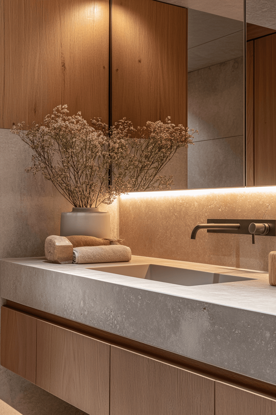Concrete-inspired finishes bring sleek, architectural cool to a minimalist bathroom. Whether in countertops, tiles, or basins, the surface adds depth and modern character. Smooth, grey textures enhance minimalism’s clean lines. Paired with matte black fixtures or seamless cabinetry, it feels urban yet serene. Concrete evokes strength without clutter. Tap here to see minimalist bathrooms that make concrete look elevated.