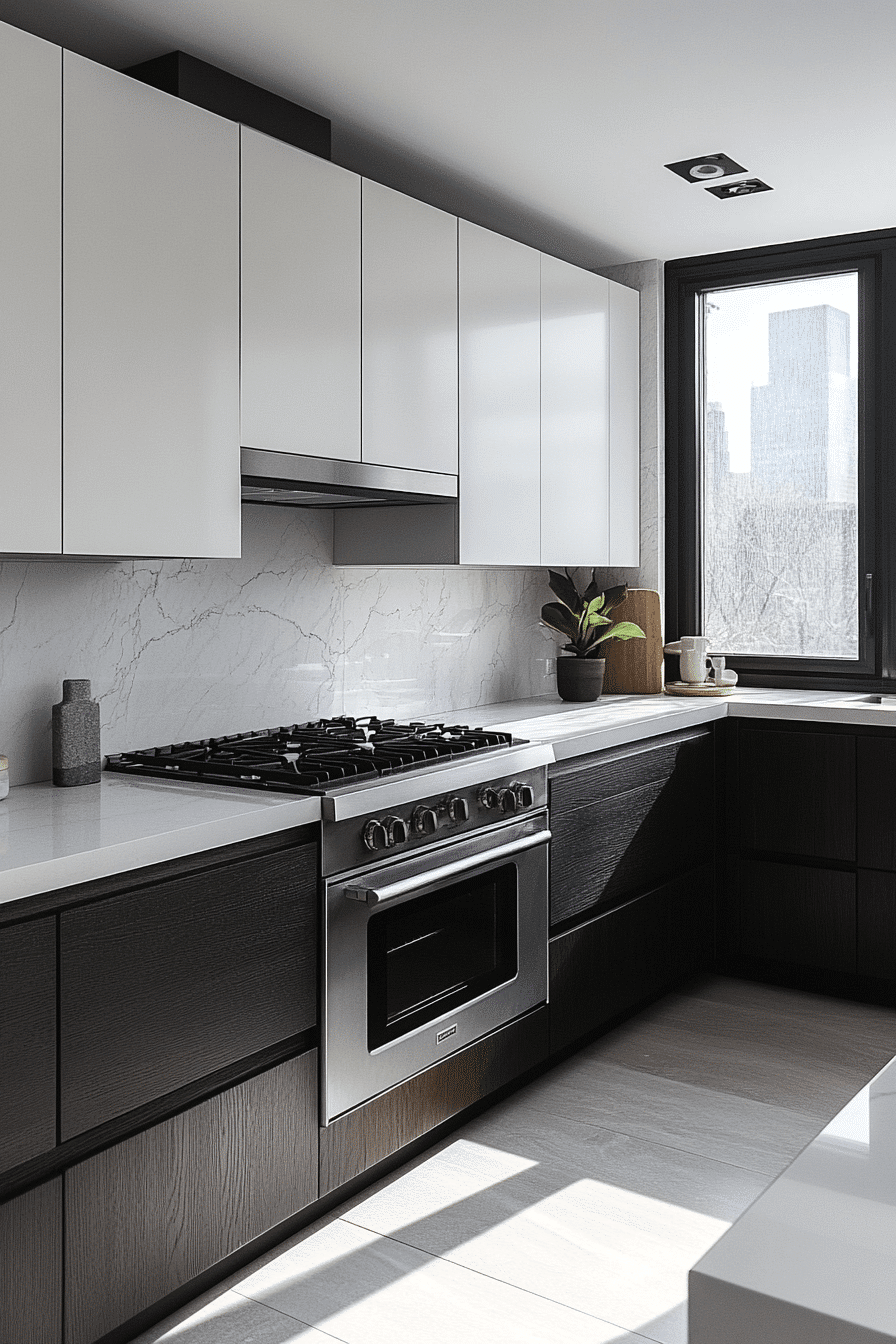 A minimalist two-tone kitchen adds depth without overwhelming the space. Combining two complementary neutrals, like white and grey, creates subtle contrast while maintaining a cohesive look. The division between upper and lower cabinets helps ground the space visually. This technique brings balance and structure to open-concept layouts. With minimal detailing, the contrast feels elegant and uncluttered. Tap to discover clever color pairings for your minimalist kitchen.