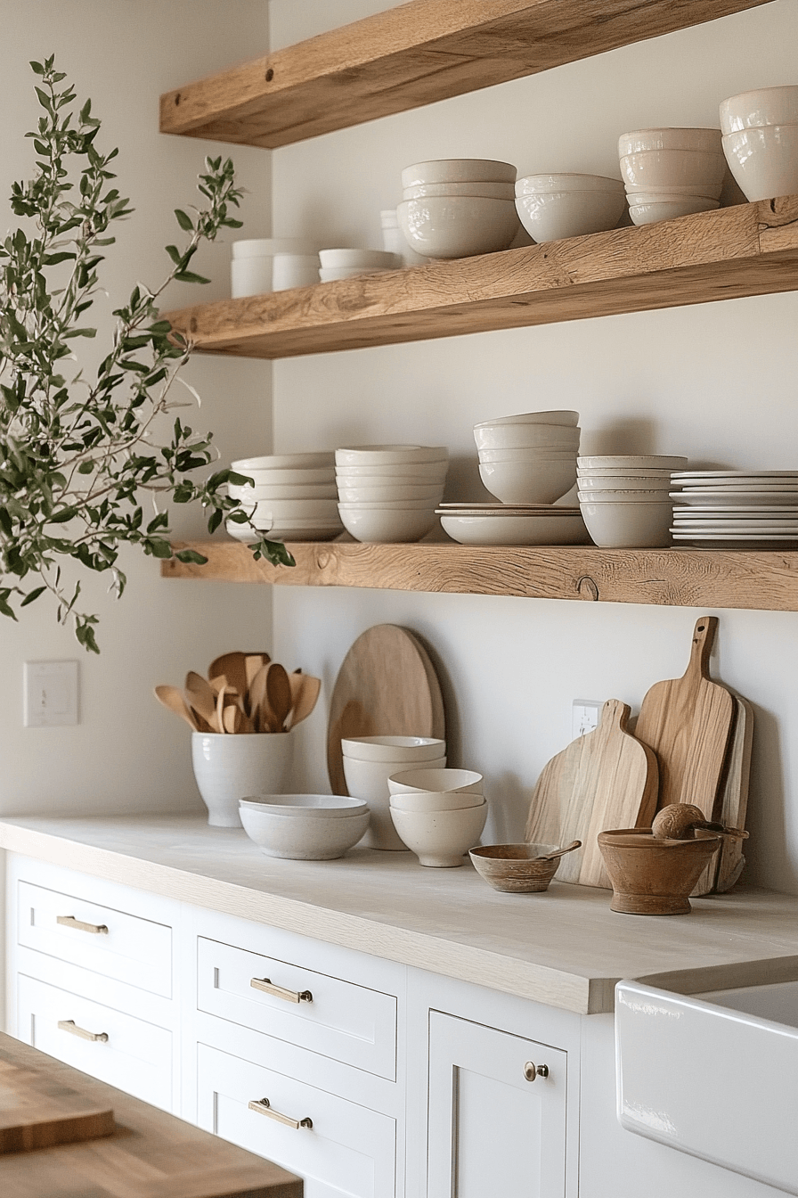 A floating shelf layout in a minimalist kitchen keeps the look open while offering practical storage. These shelves eliminate the bulk of upper cabinets and create an airy feeling. They’re perfect for displaying select pieces like ceramic bowls or neutral mugs in an organized way. With clean lines and minimal hardware, the shelves stay functional yet subtle. This layout supports a clutter-free zone without sacrificing personality. Tap for floating shelf ideas that suit your minimalist kitchen perfectly.