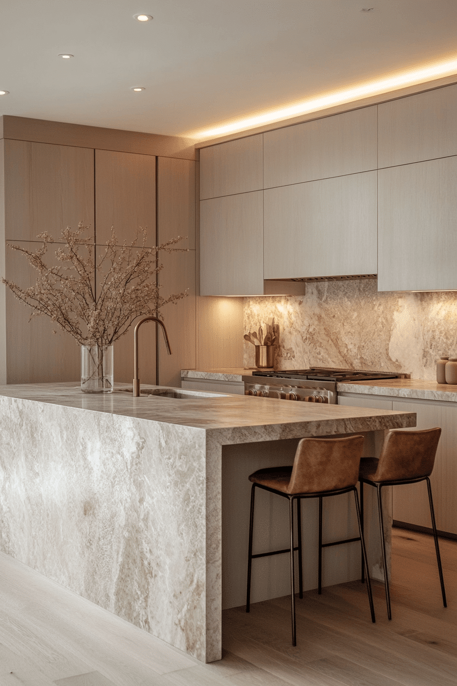 A luxury minimalist kitchen elevates simplicity with high-end materials like marble, brushed brass, and custom cabinetry. The design stays clean and refined, but with a tactile richness that whispers elegance. There’s no excess, just impeccable quality and design precision. Statement lighting or premium fixtures add sophistication without stealing focus. It’s minimalism that feels indulgent and timeless. Click now to indulge in luxury minimalist kitchen inspiration.