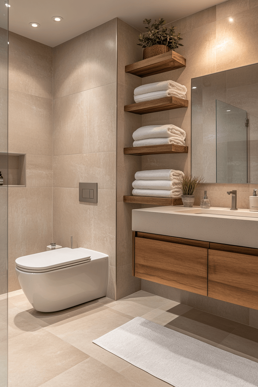 Storage plays a big role in minimalist small bathrooms. Floating shelves, recessed niches, and hidden cabinets save space. These features keep countertops clean and clutter-free. The streamlined design makes the bathroom easy to use daily. Function and beauty go hand in hand with this approach. Tap to explore more storage ideas for minimalist bathrooms.