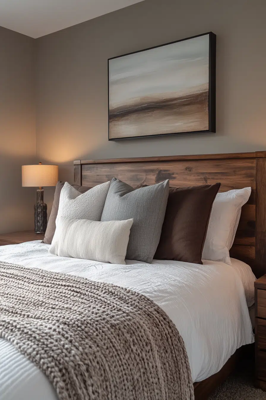 Tranquil Taupe Nook showcases how using muted taupe shades can create a soothing environment that aligns with minimalistic elegant bedroom ideas. The color taupe lends a touch of sophistication and pairs well with a variety of textures, from smooth leather to soft velvet. Minimal furnishings ensure the space remains uncluttered and restful. Ambient lighting softens the room, highlighting its peaceful elegance.