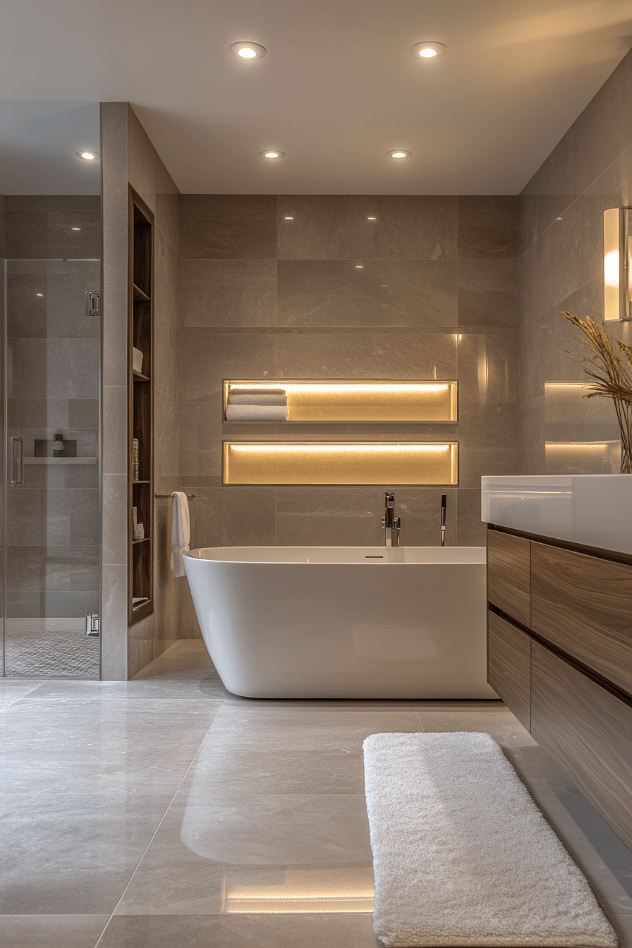 Neutral palettes make modern bathroom ideas timeless and calming. Beige, taupe, and soft gray tiles create warmth without overwhelming the space. Floating sinks and frameless mirrors add a contemporary touch. Layered lighting brings dimension to the design. Plush towels and rugs enhance comfort while maintaining style. Click here to uncover soft neutral modern bathroom inspirations.