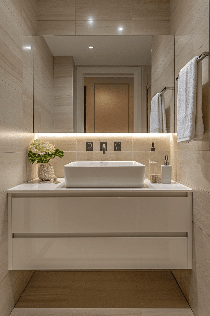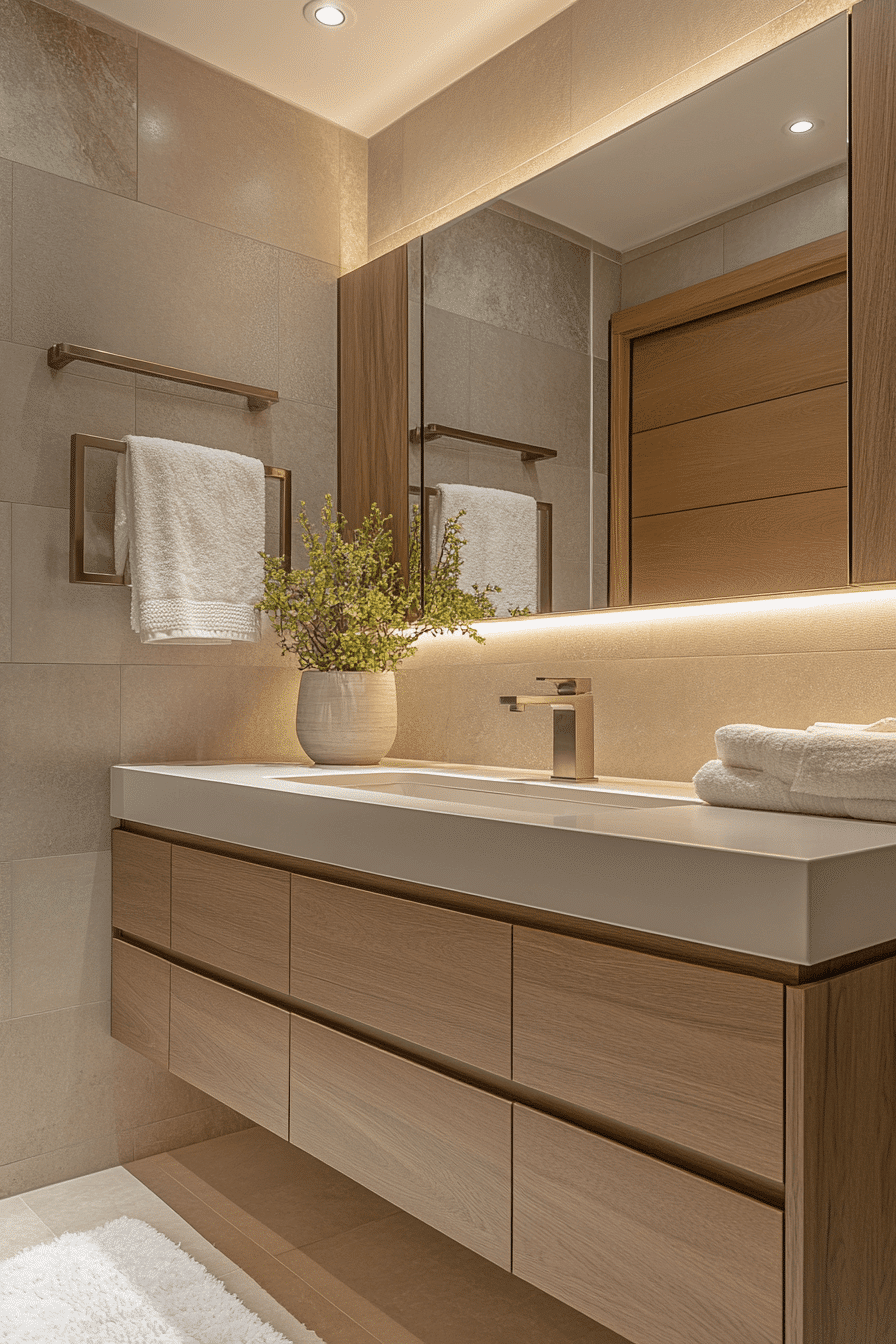 Floating vanities define many modern bathroom ideas by saving space while adding sophistication. Their sleek design creates a minimalist, airy feel. Pairing them with integrated sinks ensures a seamless look. Soft LED lighting underneath gives the vanity a subtle glow. Neutral cabinetry colors keep the aesthetic timeless. Tap now to discover floating vanity modern bathroom ideas.