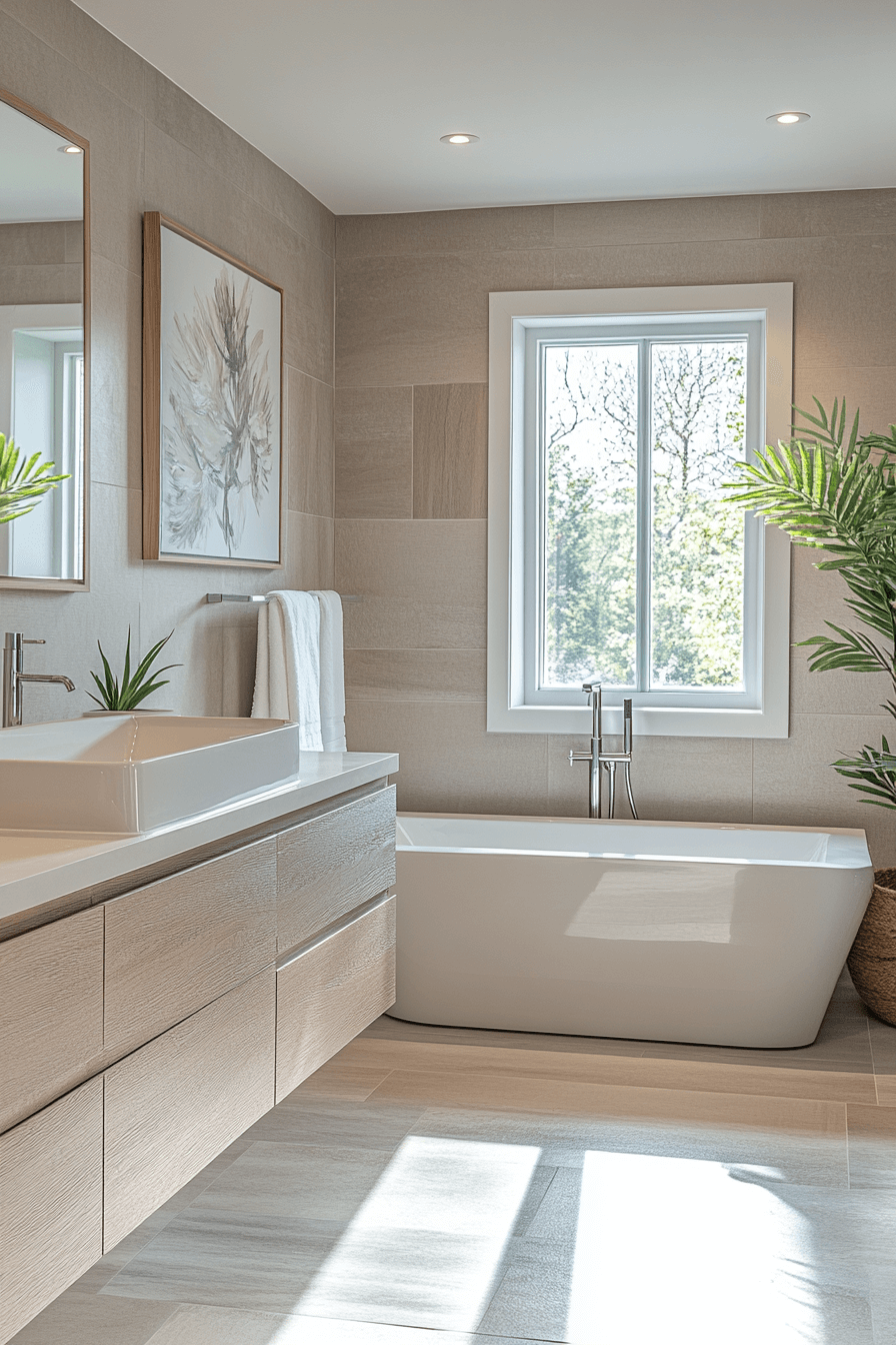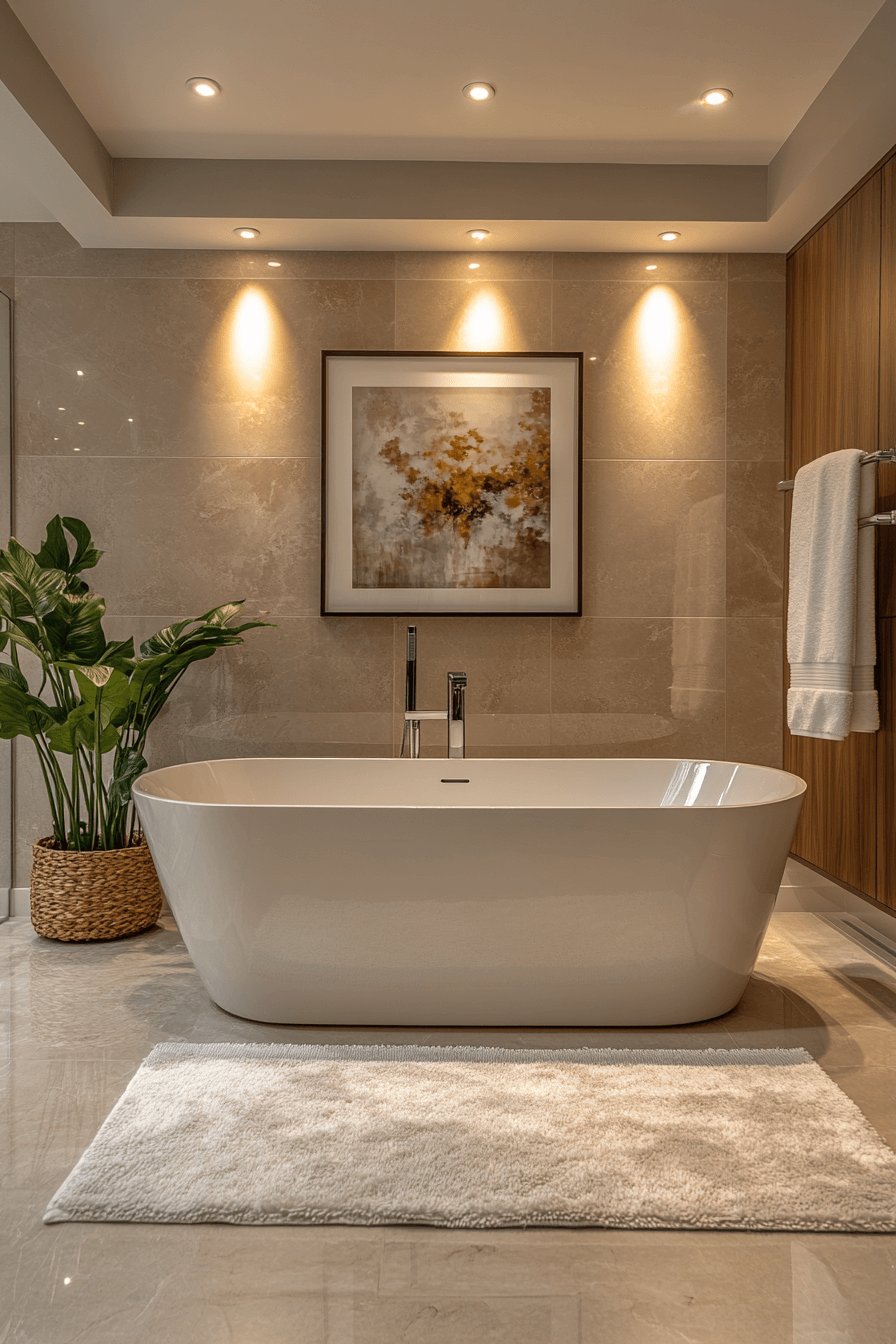 A freestanding tub creates a luxurious centerpiece in modern bathroom ideas. Smooth curves contrast with clean-lined vanities beautifully. Neutral tiles highlight the tub as the focal point. Pendant lights add dramatic ambiance above. Minimal décor keeps the attention on the tub. Click here to discover modern freestanding tub inspirations.
