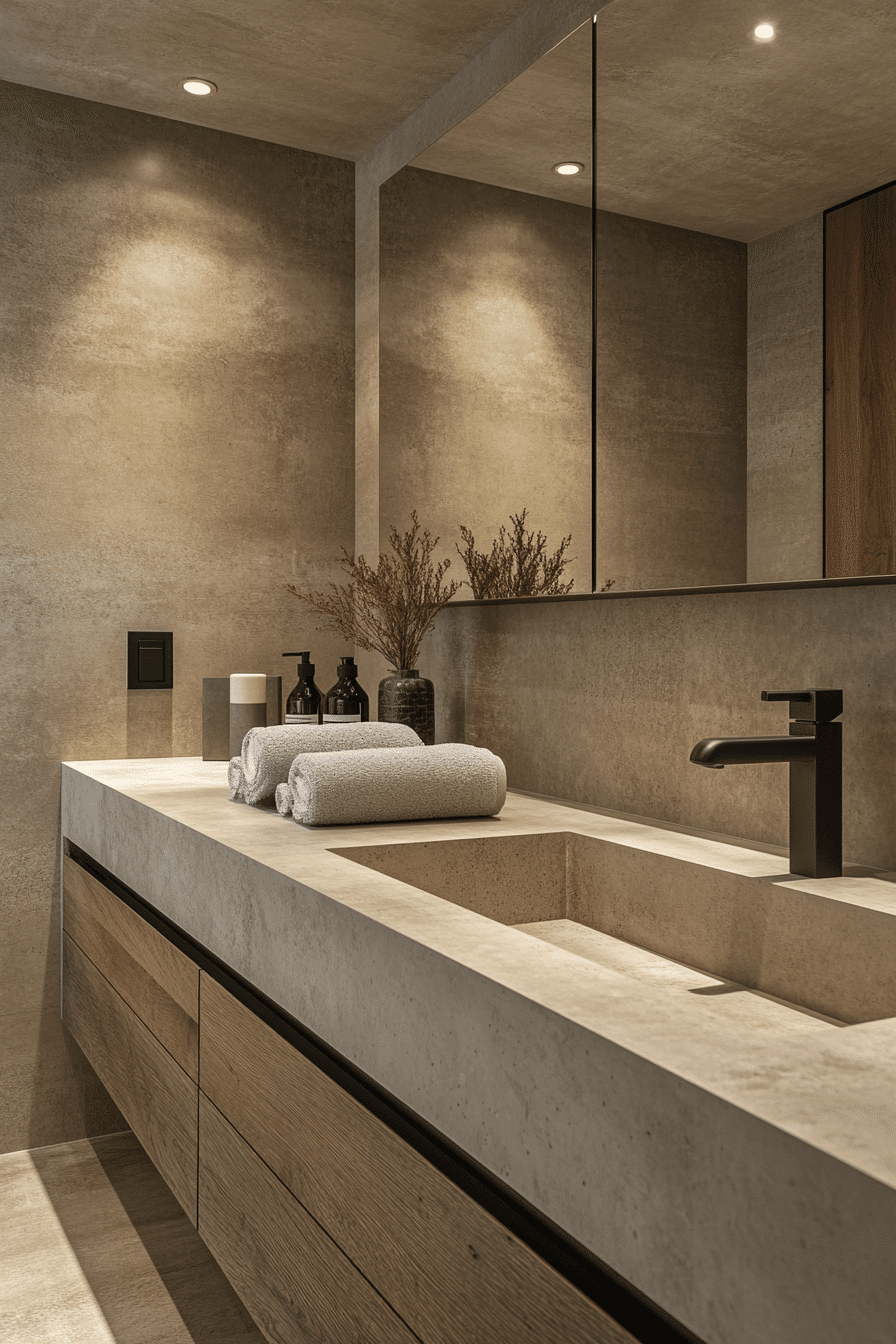 Concrete elements add sleek simplicity to modern bathroom ideas. Smooth walls and floors create a clean, minimal look. Floating sinks and frameless glass showers enhance the raw elegance. Accent lighting prevents the design from feeling cold. Neutral accessories tie the room together. Tap here to explore smooth concrete finish bathroom inspirations.