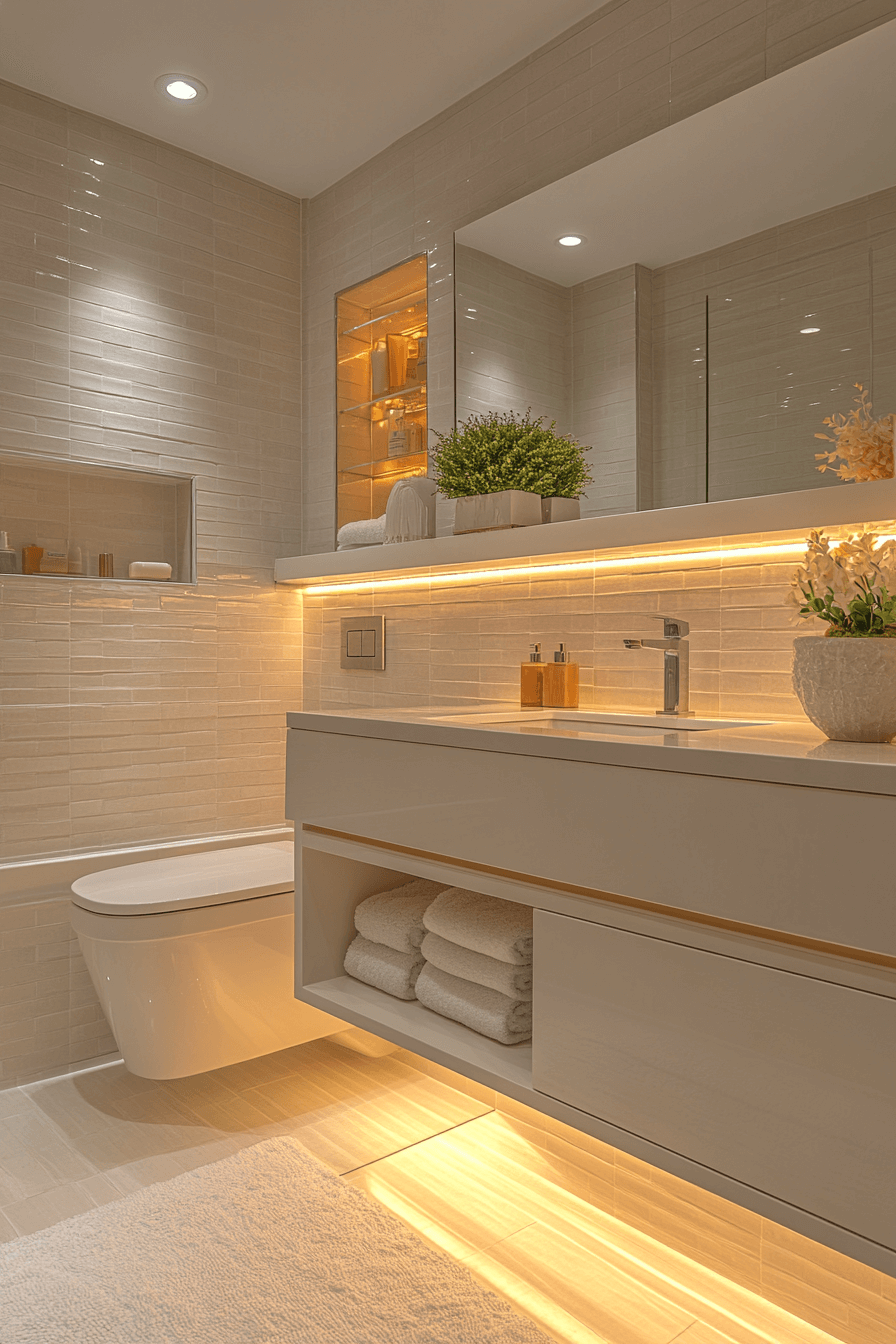 Lighting transforms modern bathroom ideas from basic to extraordinary. Statement pendant lights add personality. LED mirrors create subtle elegance. Recessed ceiling lights enhance brightness without clutter. Combined, these layers of light create depth and sophistication. Click here to see elegant lighting modern bathroom inspirations.