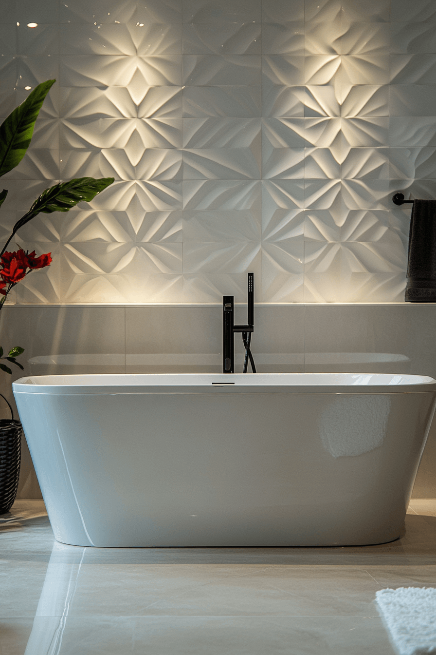 Statement tiles transform modern bathroom ideas into works of art. Bold geometric patterns or textured finishes make the walls stand out. Simple vanities and fixtures balance the dramatic effect. Accent lighting highlights the tilework beautifully. Neutral flooring keeps the space cohesive. Click now to discover bold tile statement bathroom inspirations.
