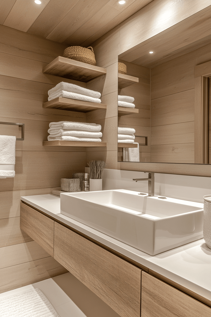 Floating shelves add style and practicality to modern bathroom ideas. Sleek designs make them feel contemporary. Neutral finishes allow them to blend seamlessly with the space. Placed above vanities or tubs, they enhance organization. Accent lighting underneath adds subtle drama. Tap now to see chic floating shelf bathroom inspirations.