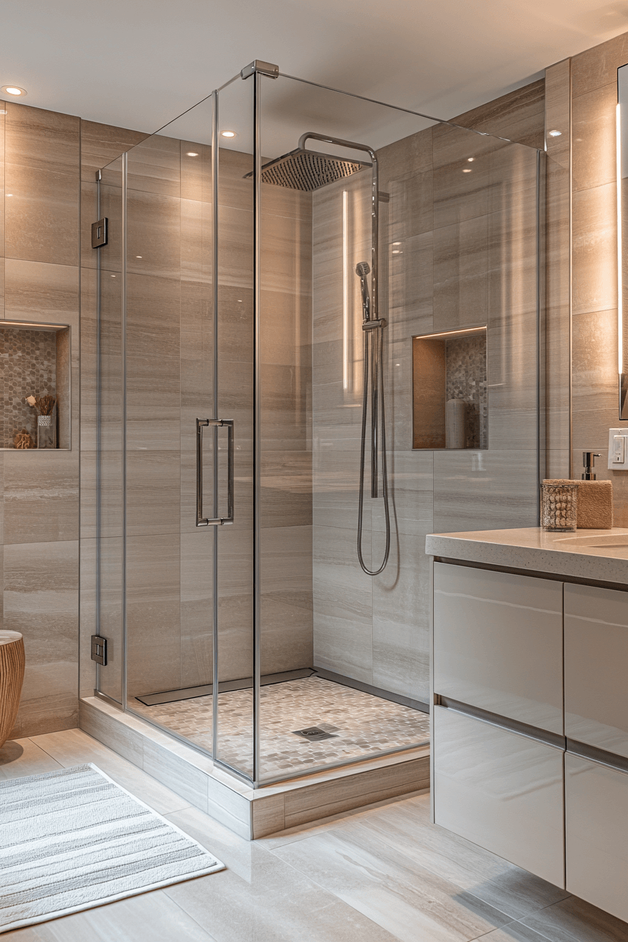Frameless glass showers showcase elegance in modern bathroom ideas. Their clean lines make bathrooms feel larger and more open. Rainfall showerheads add a luxurious spa-like experience. Neutral tiles create a sophisticated backdrop. Recessed lighting highlights the shower space beautifully. Tap here to see luxe glass shower modern bathroom designs.