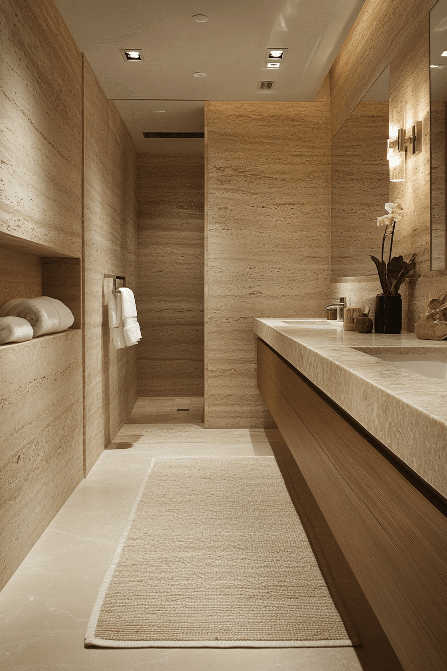 Polished stone brings elegance and depth to modern bathroom ideas. Granite or quartz countertops pair seamlessly with sleek vanities. Floor-to-ceiling stone walls create a luxurious atmosphere. Simple lighting fixtures highlight the reflective surfaces. Neutral furniture completes the polished aesthetic. Tap to explore polished stone serenity modern bathroom designs.