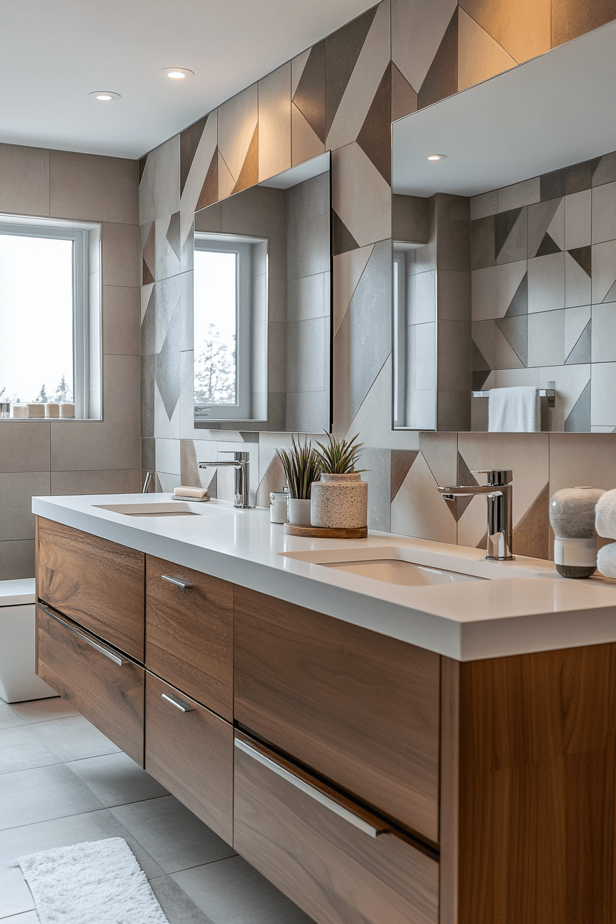 Geometric wall patterns define edgy modern bathroom ideas. Large tiles with angular designs create dramatic flair. Neutral vanities balance the boldness. Simple lighting highlights the patterns effectively. A minimal palette keeps the focus on the walls. Click here to explore bold geometric wall bathroom inspirations.