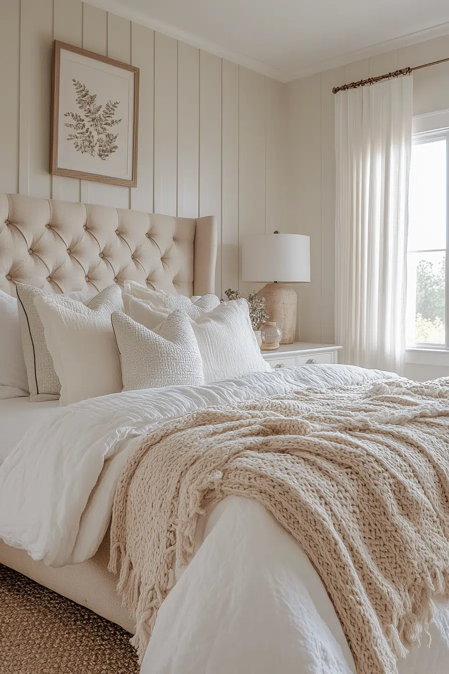 Soft neutrals bring a calm and timeless look to modern farmhouse bedroom ideas. With layers of ivory, beige, and taupe, the room feels both relaxed and refined. These tones help reflect natural light and keep the space bright. Pairing them with soft bedding and light wood finishes creates a cozy yet uncluttered aesthetic. This approach works beautifully in any size bedroom.