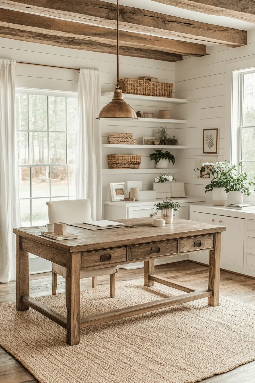 Weathered Charm highlights aged textures like whitewashed wood, iron finishes, and chipped paint in your modern farmhouse office. These elements create a storied, welcoming environment that feels authentic. When paired with clean-lined office tools, the look becomes effortlessly stylish. Linen drapery and woven baskets add tactile warmth. It’s rustic yet completely work-ready.
