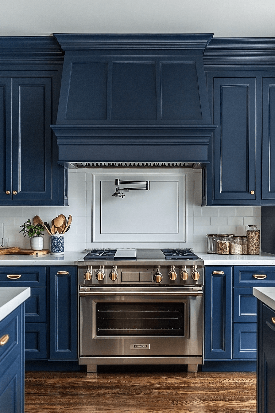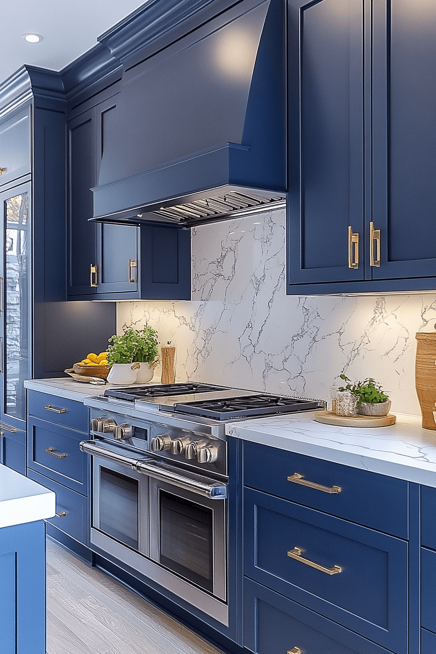 Deep navy cabinets bring richness and drama to modern kitchen cabinet design. The bold hue feels luxurious when paired with metallic hardware. Sleek lines keep the aesthetic polished and modern. Neutral countertops balance the intensity of navy. The overall effect is bold, elegant, and stylish. Click here to see deep navy cabinet inspirations.