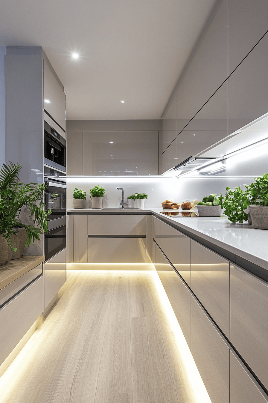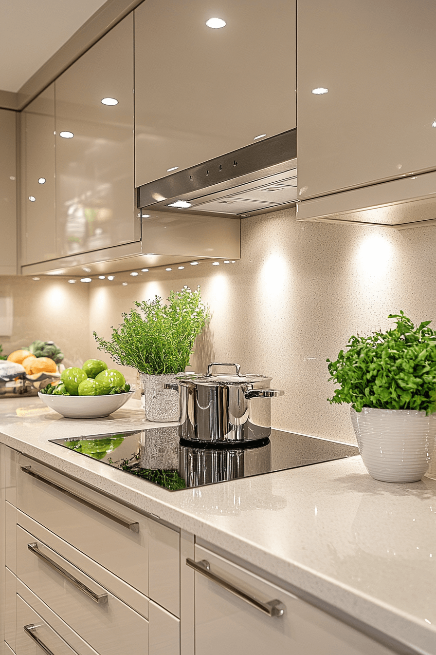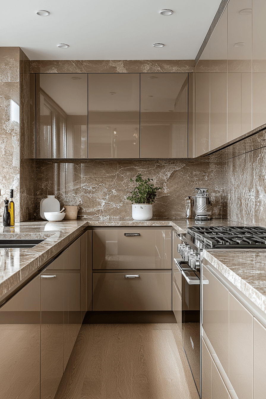 High-gloss neutral cabinets bring sophistication to modern kitchen cabinet design. Shades of beige, taupe, or gray with reflective finishes create a calming yet stylish vibe. Glossy surfaces bounce light around the room, enhancing openness. These cabinets pair beautifully with chrome fixtures and sleek stone countertops. The effect is upscale, polished, and timeless. Tap now to discover high-gloss neutral cabinet inspirations.