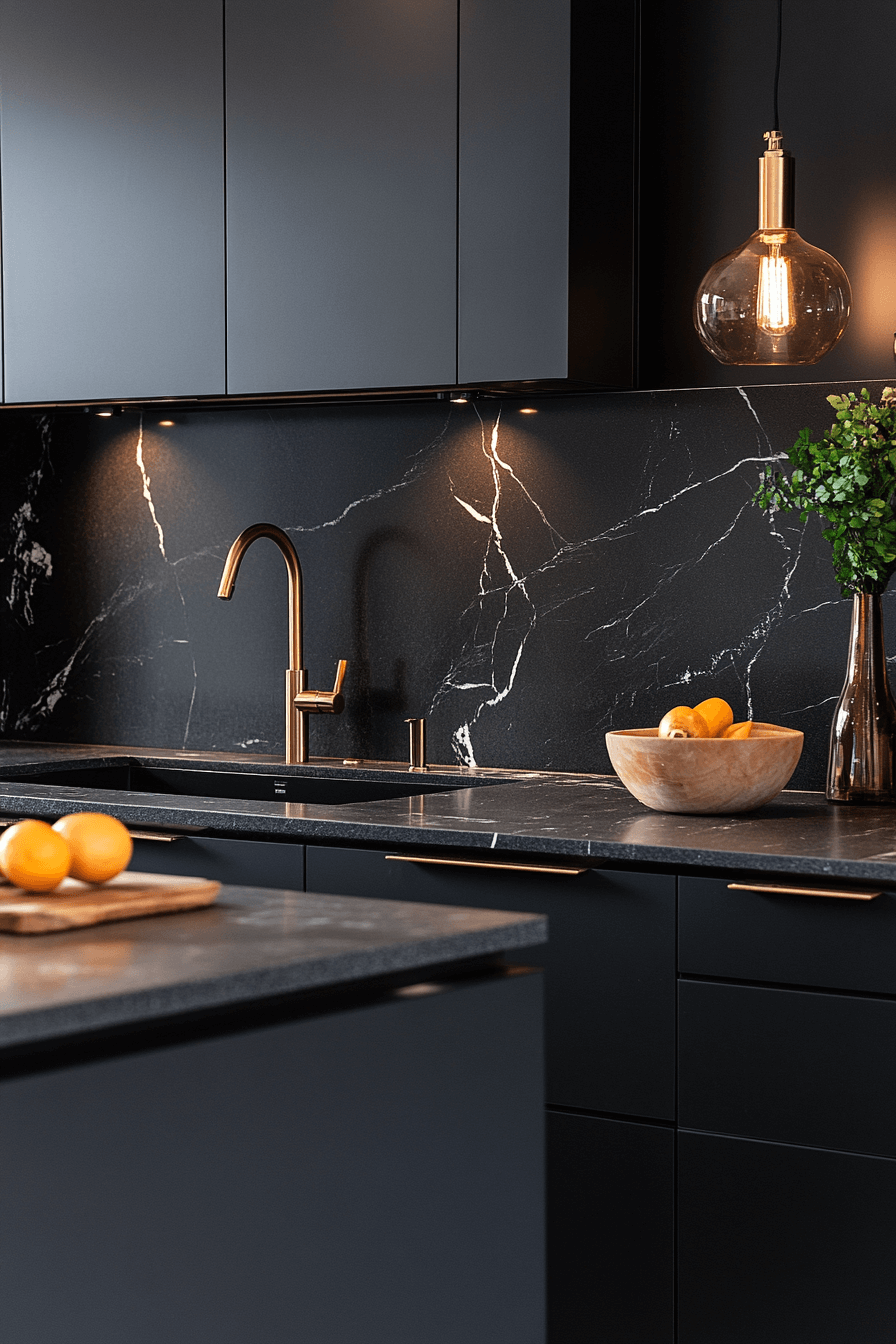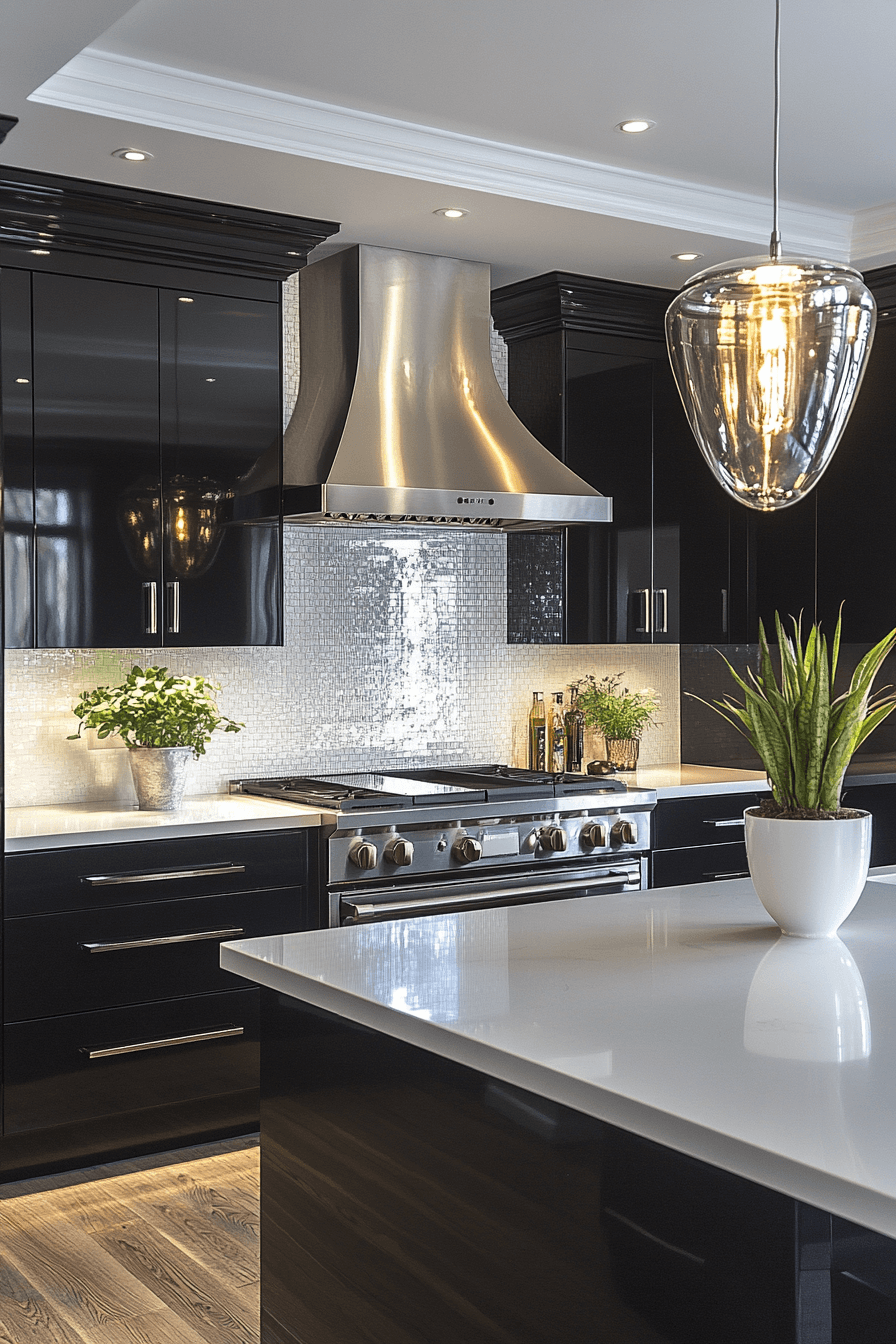 High-gloss black cabinets make a bold and sophisticated statement in modern kitchen cabinet design. Their reflective surfaces add drama and luxury. Paired with white counters, the contrast feels striking and polished. Chrome or gold hardware elevates the rich tone. The result is a modern kitchen full of bold personality. Click here to uncover high-gloss black cabinet inspirations.