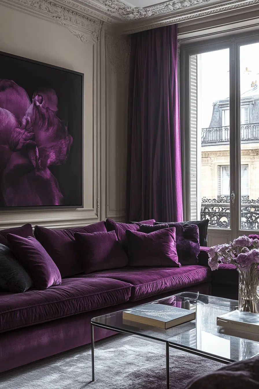 Plush Purple Parlour: In the Plush Purple Parlour, vibrant purple hues add a touch of royal elegance to the modern Victorian living room. The color is complemented by neutral furnishings and contemporary decor items that ensure the space does not become overwhelming. This design is ideal for those looking to inject personality and warmth into their living area while maintaining a modern aesthetic. Plush fabrics and soft lighting make the room inviting and comfortable.
