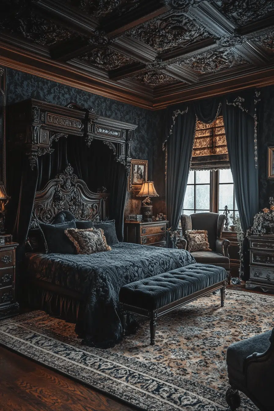 The Edwardian Eclipse Bedroom features the refined elegance of Edwardian furniture combined with a dark, moody color scheme. Intricate floral wallpapers and heavy wooden bed frames are key elements of this style. Soft, layered lighting highlights the detailed woodwork and plush fabrics, creating a comfortable yet sophisticated space. This bedroom design is perfect for those who appreciate the grace of the Edwardian period with a modern, moody twist.