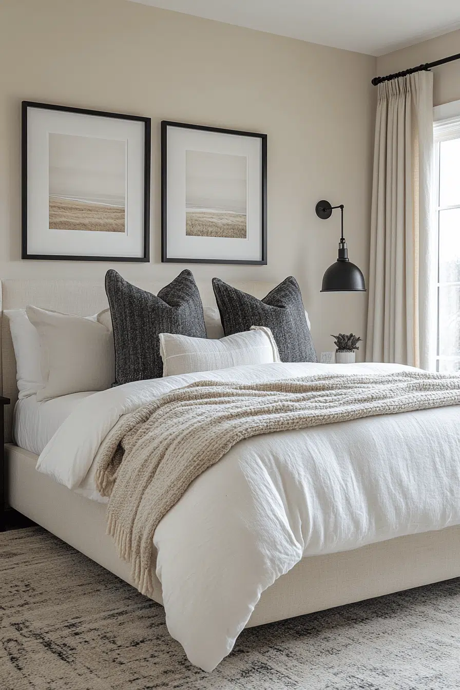 A neutral bedroom with black accents creates a serene space through soft beige walls and crisp black details. The monochrome look feels clean and calming, ideal for restful nights. Black-framed art and matte light fixtures add subtle definition. Bedding in ivory and gray tones maintains a peaceful palette. This setup highlights tranquility while still feeling contemporary.