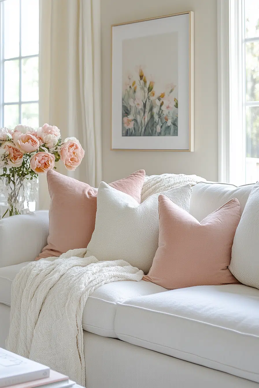 Subtle pastel accents are perfect for neutral spring home decor ideas, adding just a hint of color without overwhelming the space. Soft pinks, blues, and greens blend seamlessly with neutral backgrounds, creating a serene and welcoming environment. These accents can be introduced through pillows, artwork, or decorative throws. They keep the decor light and airy, ideal for spring.