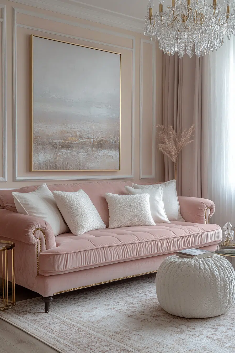 - Furniture: rolled-arm velvet sectional sofa in blush pink with matching chaise extension