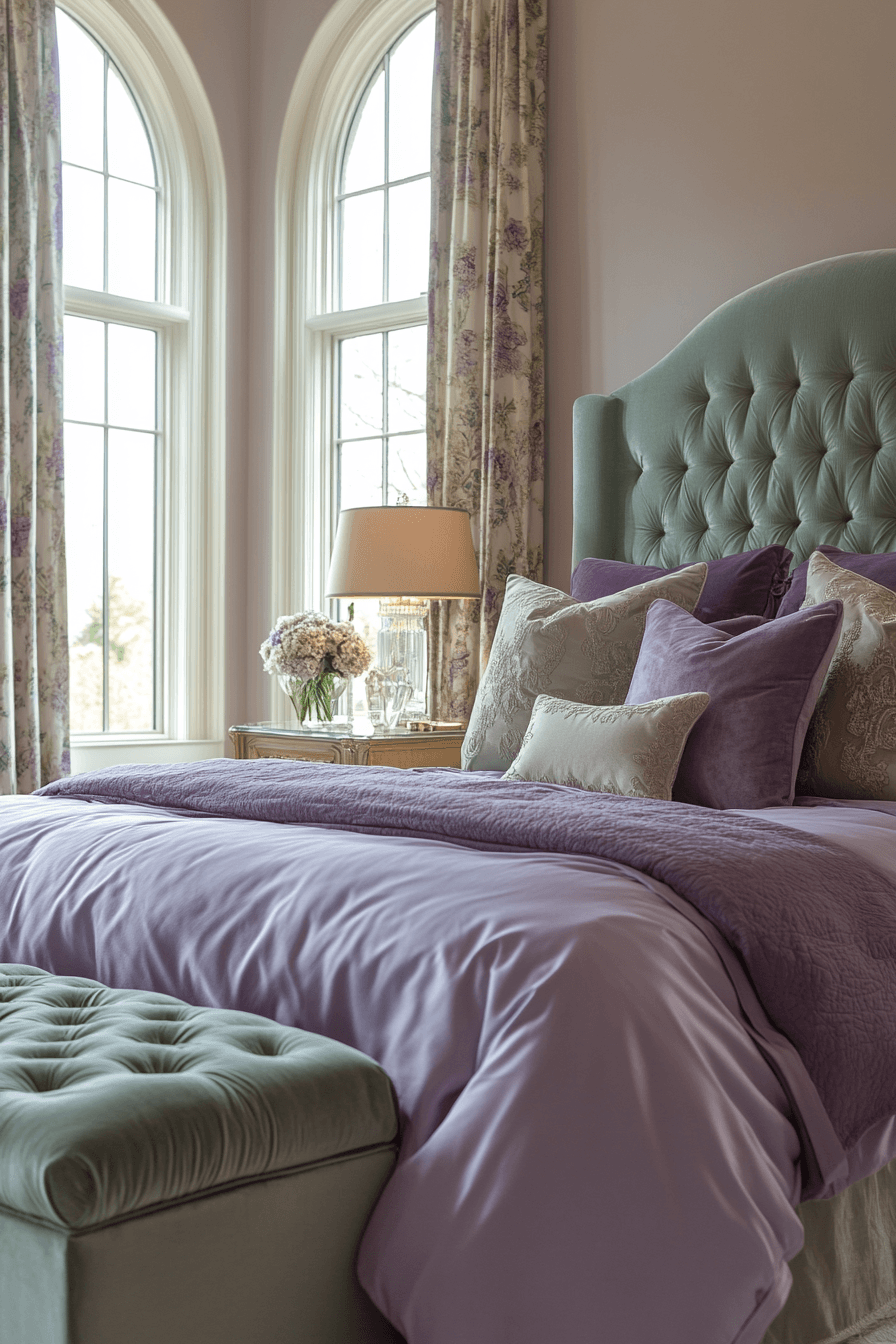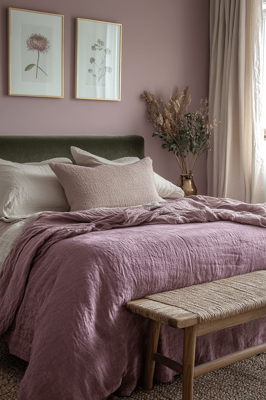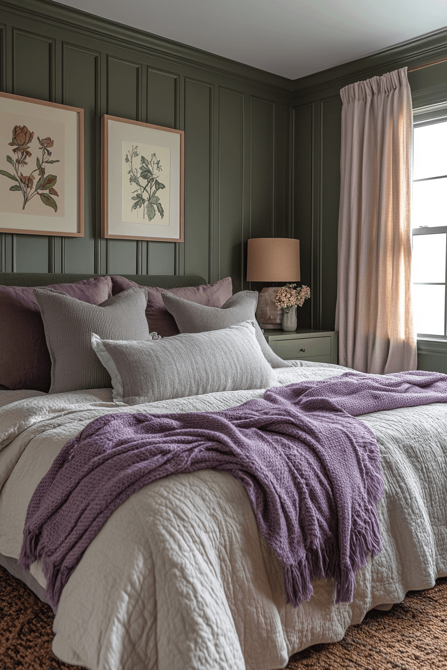 The chic plum & sage theme brings sophisticated energy to any purple and green bedroom by blending muted jewel tones with soft botanical hues. This combination offers a calming yet rich atmosphere that feels upscale and grounded. Incorporating luxurious textures like velvet or brushed cotton elevates the design effortlessly. Greenery and plum-toned accessories provide cohesion without overwhelming the senses. The result is a stylish retreat filled with harmony and balance. Tap for more stunning purple and green bedroom inspiration!