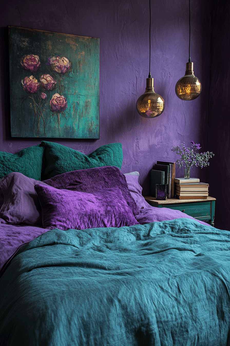 Emerald & amethyst energy radiates opulence in a purple and green bedroom that feels both regal and modern. These deep jewel tones bring instant drama and elegance. Paired with rich fabrics like velvet and satin, the space becomes a personal retreat. Keep accessories minimal to let the colors speak for themselves. This bold combo never goes out of style. Tap to explore this luxurious pairing!