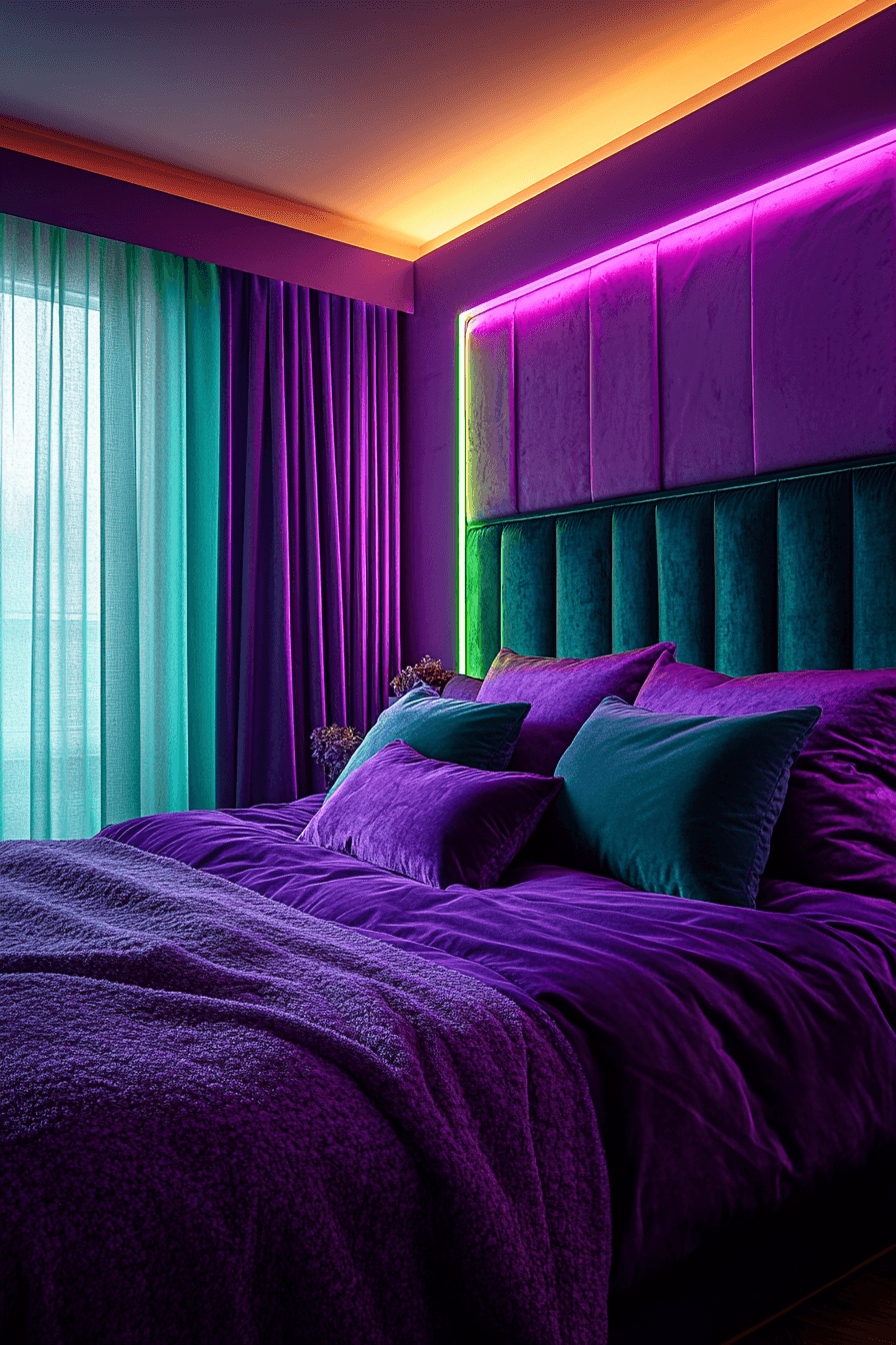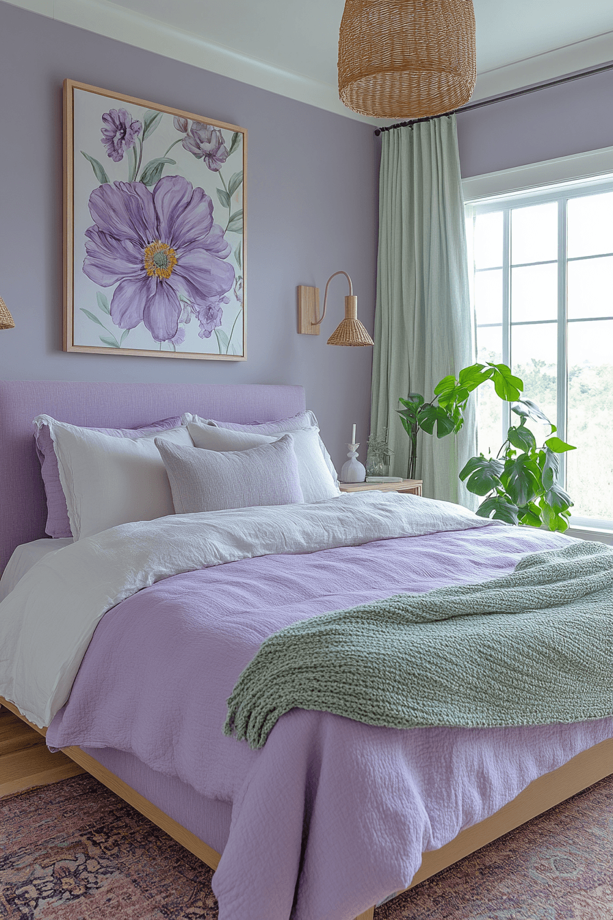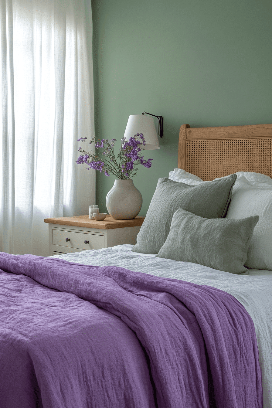 Lush violets & greens instantly transport you to a garden-like purple and green bedroom filled with elegance and natural beauty. This palette feels rich but never overwhelming, offering just the right amount of color. The balance between green’s grounding nature and purple’s regal vibes is key. Layer textures like linen, velvet, and bamboo for added interest. This look is made for stylish, restful nights. Uncover more ways to style your space.
