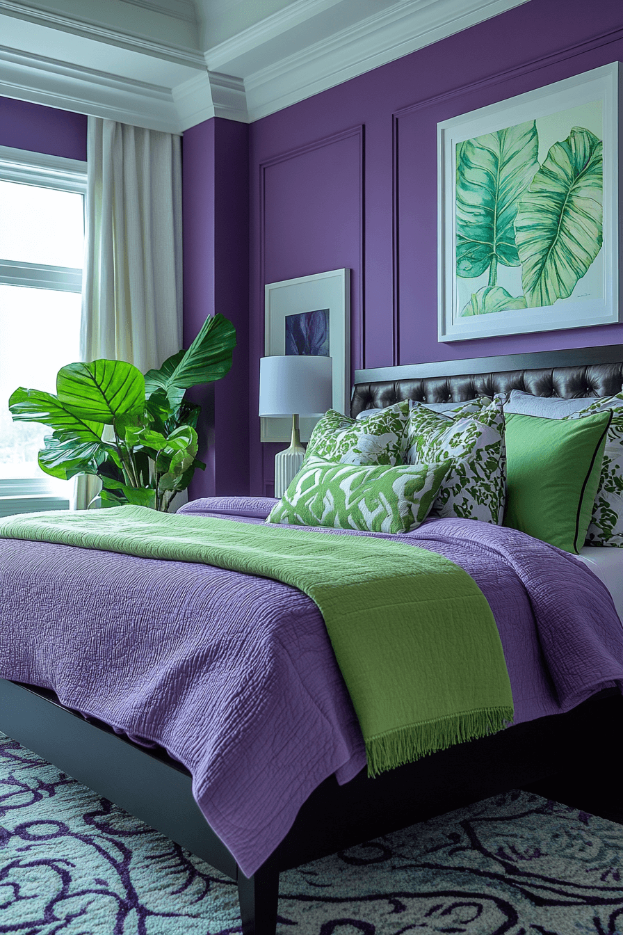 Vibrant purple green escape captures the joyful harmony of a purple and green bedroom through its playful use of rich tones and soothing textures. This palette works beautifully by pairing bold purples with fresh, leafy greens to create a serene yet energizing space. The contrast between cool and warm tones in this purple and green bedroom makes it visually exciting while still feeling cohesive. Accents like botanical prints, layered linens, and soft lighting add personality and comfort to the look. Using various shades from lavender to moss green adds depth and a touch of whimsy to the room. Click to explore the full look!