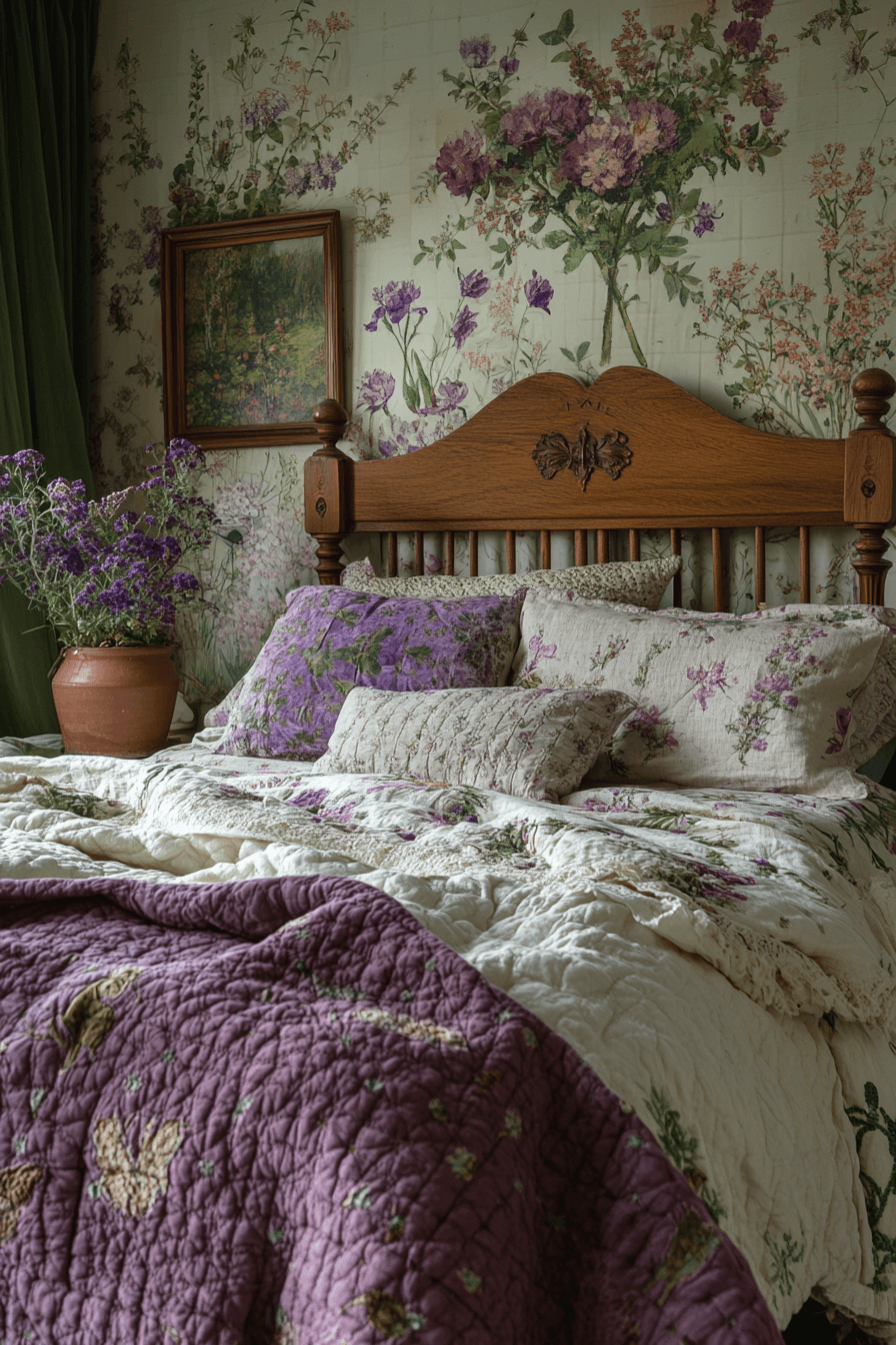 Floral pop hideaway makes your purple and green bedroom feel like a secret garden full of playful charm. The bold florals, lush greenery, and rich purples create an immersive, cozy vibe. It’s a room that sparks creativity and invites rest. Use floral bedding or accent walls to make a statement. Don’t be afraid to mix prints for extra personality. Get inspired with this cozy concept!