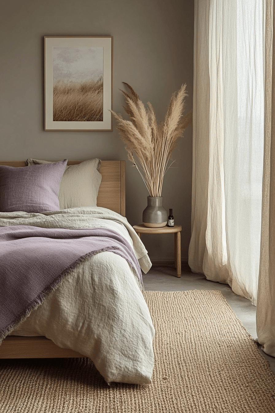 Nature kissed neutrals add a calm, earthy feel to your purple and green bedroom using softer tones like lilac and sage. These hues blend effortlessly with creams, beiges, and taupes for a relaxed, spa-like look. Minimal decor and clean lines let the color story take center stage. Add fresh florals or natural wood to tie it all together. It’s simplicity with just enough color. See how this peaceful palette works.