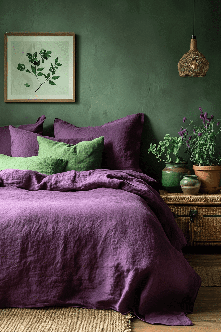 Earthy jewel oasis is a grounded take on the purple and green bedroom, blending vibrant hues with natural textures. The key to this look is using earth-inspired materials like jute, rattan, and reclaimed wood. Purple throws or green walls add just enough richness without overwhelming the natural vibe. It feels sophisticated and eco-conscious at the same time. Add a few candles or woven baskets to complete the look. See how you can create this earthy escape!