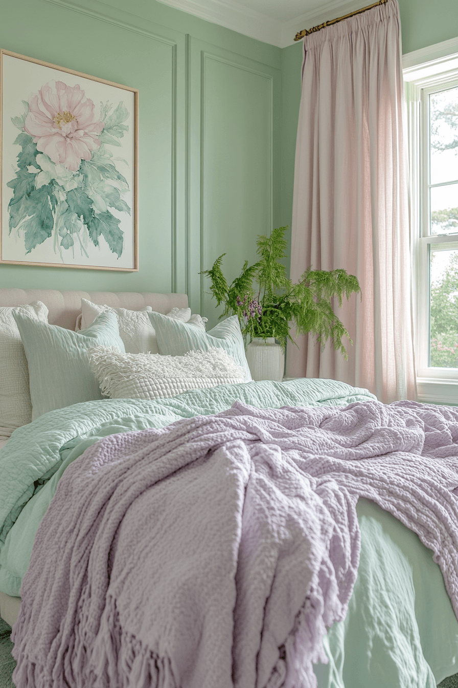 Sage and orchid style transforms your purple and green bedroom into a spa-like retreat with soft, luxurious touches. The pairing of pastel green and vivid orchid feels modern and peaceful. Use minimalist furniture to let the color scheme shine. Incorporate textures like linen, marble, and ceramic for added elegance. It’s a design that feels both refreshing and restful. Click to see how it all comes together.