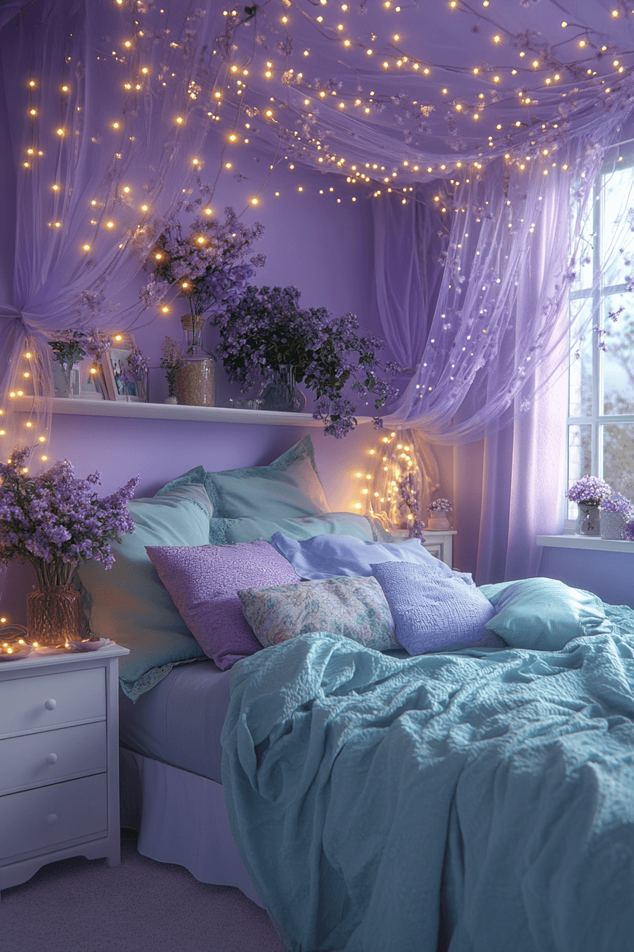 Purple ivy paradise turns your purple and green bedroom into a leafy sanctuary with cascading plants and violet-toned accents. The theme channels nature’s serenity while maintaining a chic aesthetic. Think woven textures, botanical wall decals, and plush plum cushions. This room becomes a restful oasis with just the right amount of charm. It’s nature-meets-glam at its finest. See the full look now!