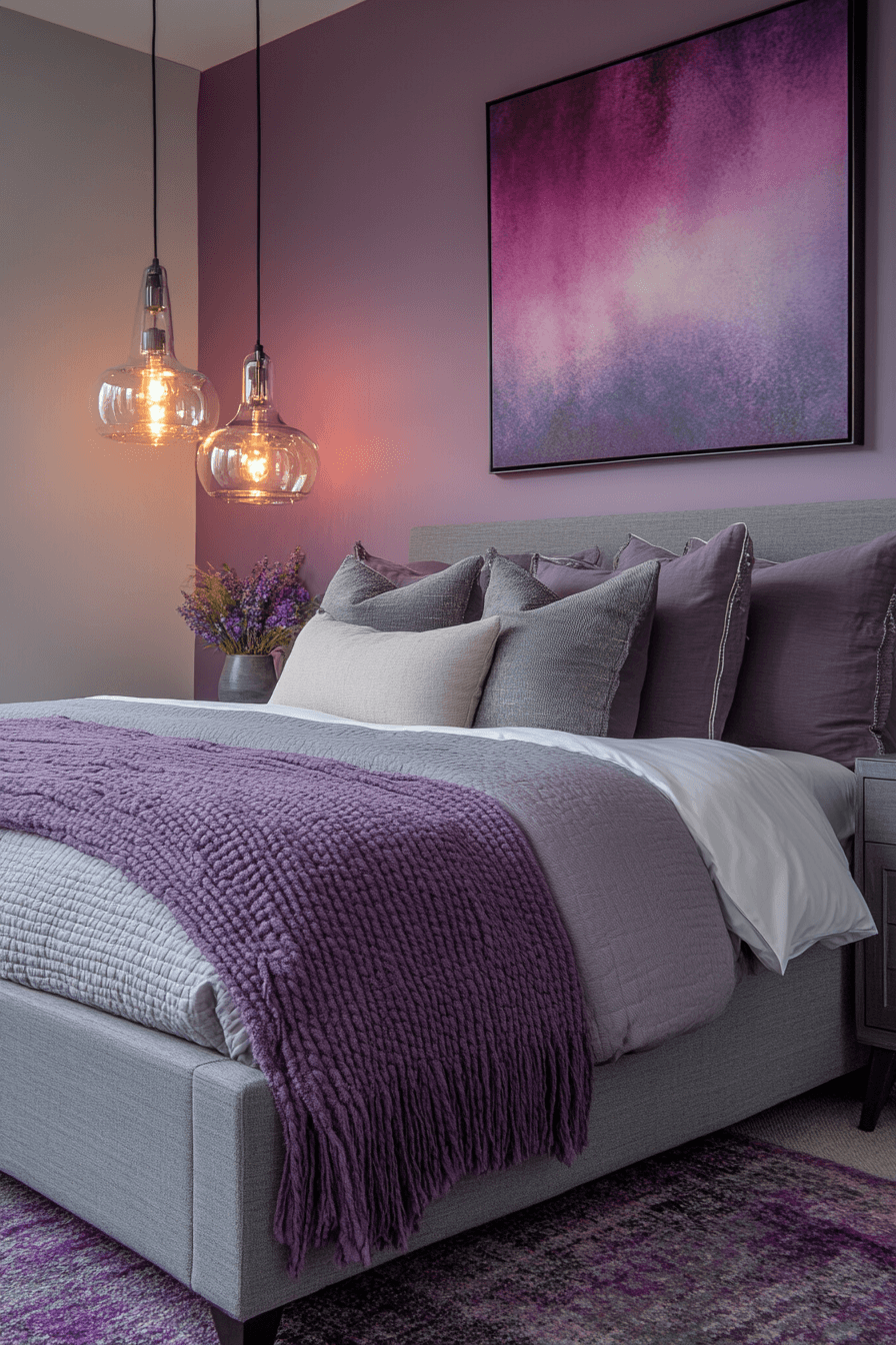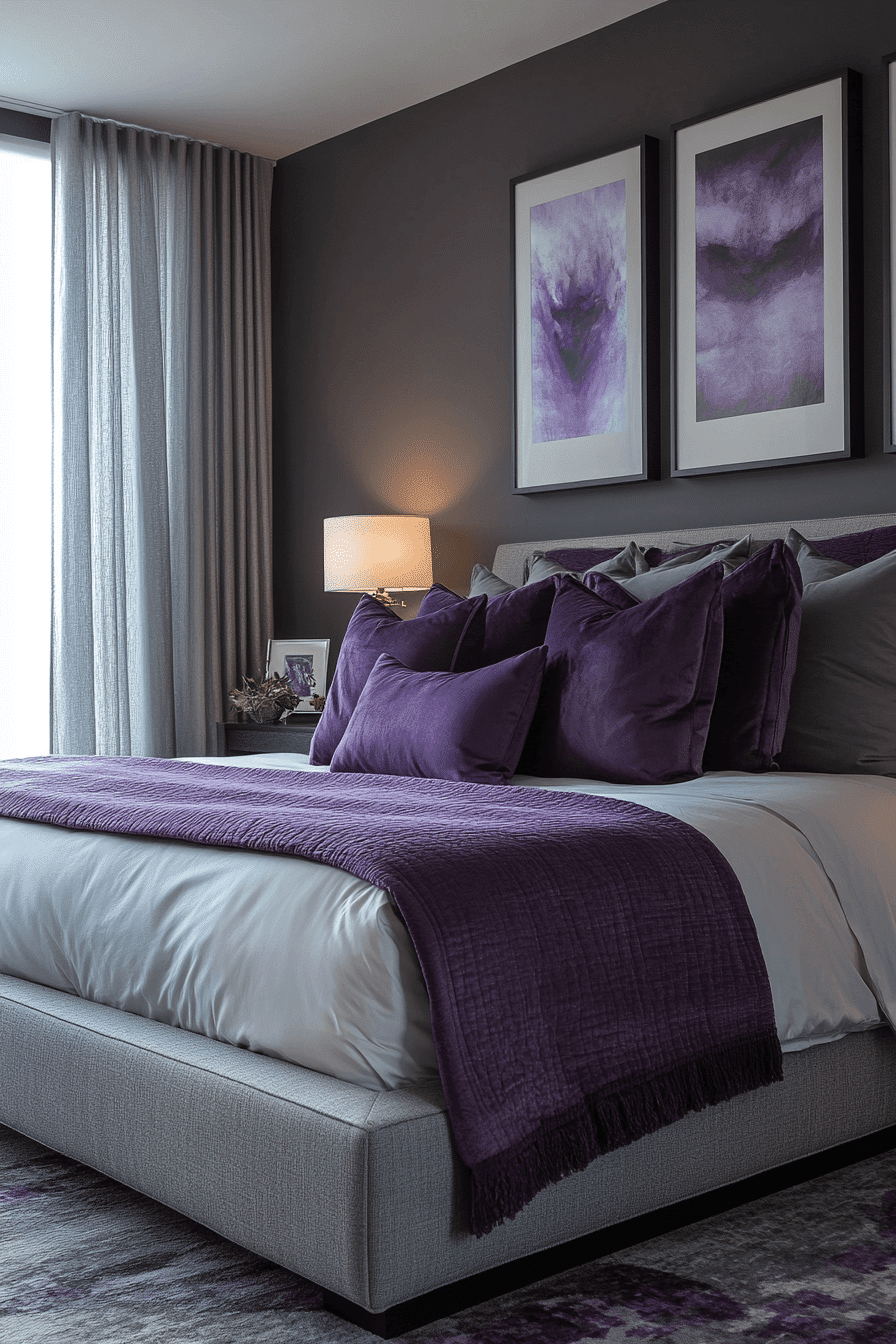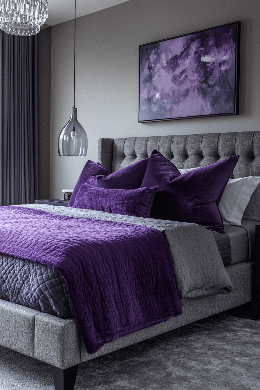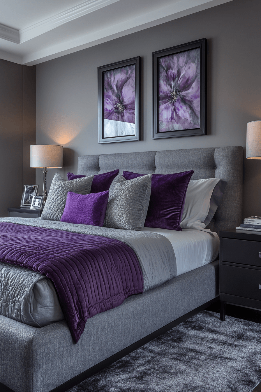 Plum accents in a grey space define sophisticated purple and grey bedroom ideas. The grey base creates neutrality, allowing plum décor to stand out. Deep shades add drama and elegance. Simple lines prevent the room from feeling overdone. This works because it balances richness with restraint. Tap here to see more plum-accented grey bedrooms.