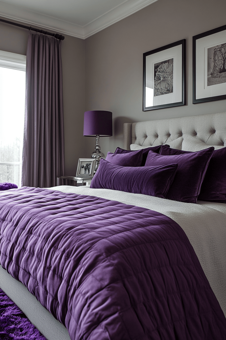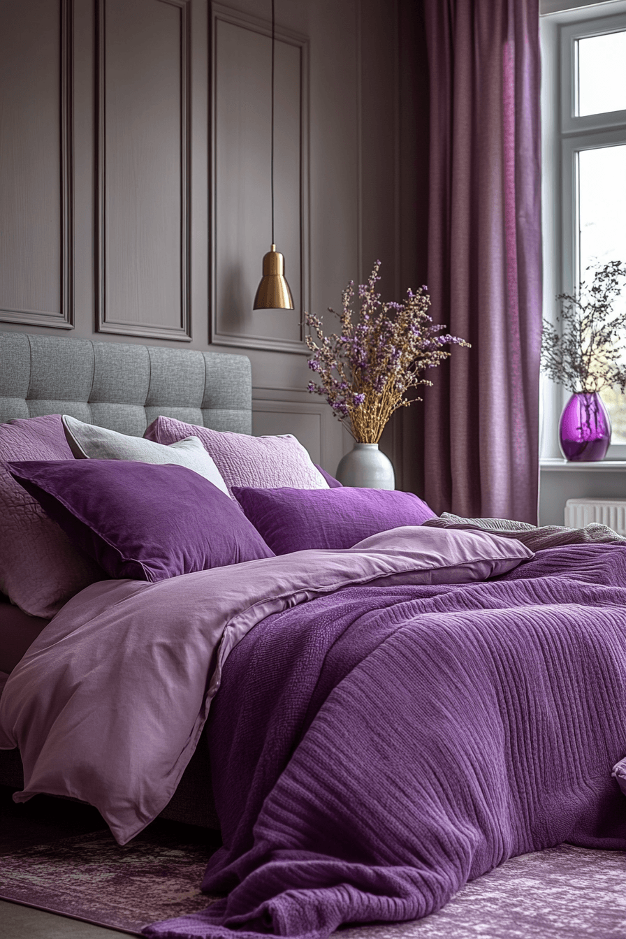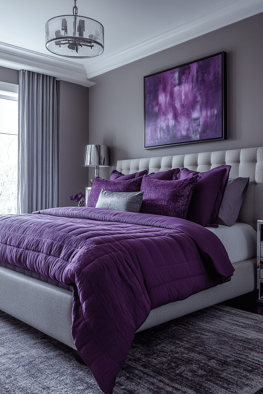 Plum accents in a grey space define sophisticated purple and grey bedroom ideas. The grey base creates neutrality, allowing plum décor to stand out. Deep shades add drama and elegance. Simple lines prevent the room from feeling overdone. This works because it balances richness with restraint. Tap here to see more plum-accented grey bedrooms.
