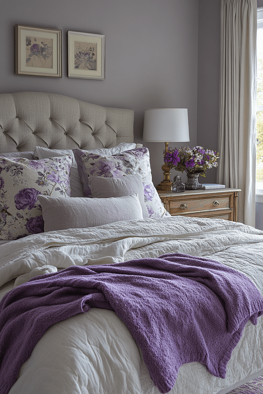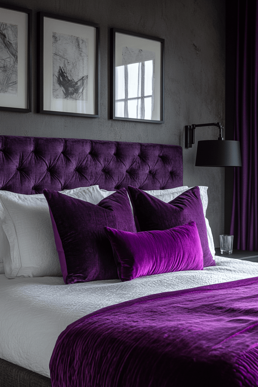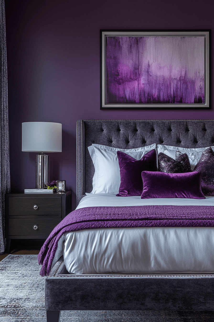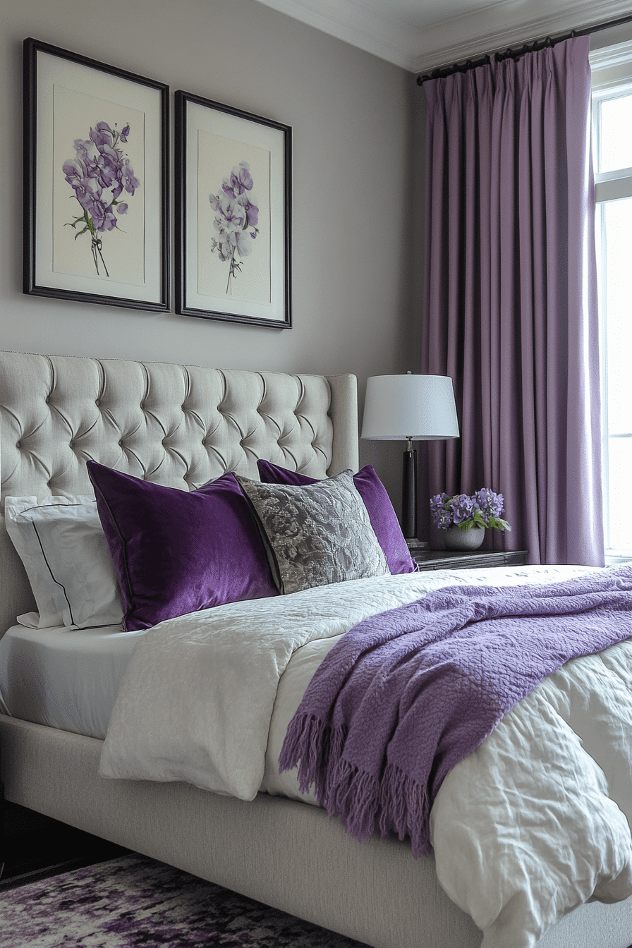 Plum accents in a grey space define sophisticated purple and grey bedroom ideas. The grey base creates neutrality, allowing plum décor to stand out. Deep shades add drama and elegance. Simple lines prevent the room from feeling overdone. This works because it balances richness with restraint. Tap here to see more plum-accented grey bedrooms.