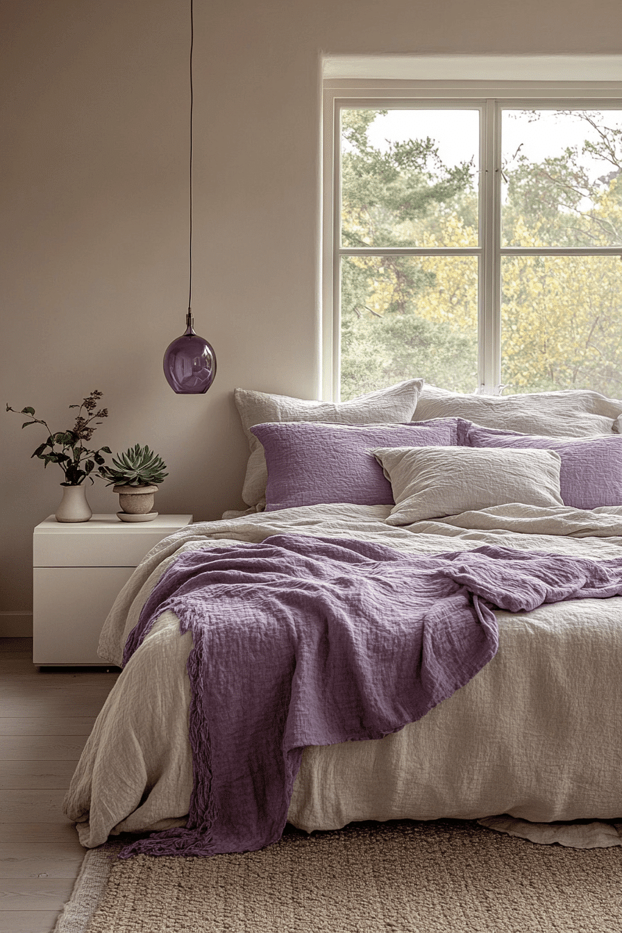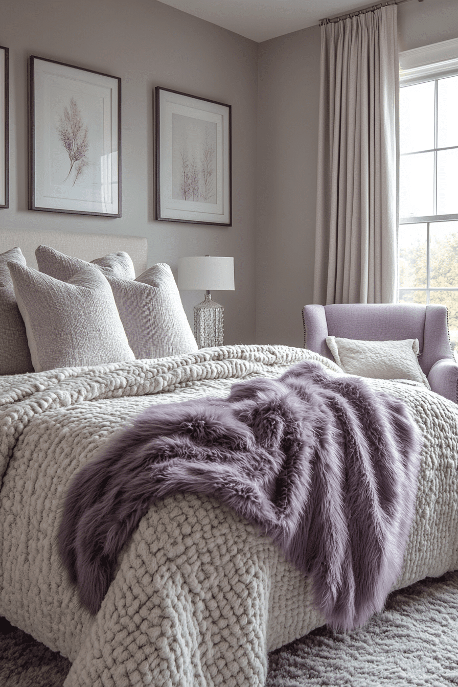 Cool tones with cozy layers define these purple and grey bedroom ideas. Light grey walls keep the room bright, while purple accents warm up the atmosphere. Textures like throws and cushions bring softness. Layered lighting completes the inviting feel. This works because it combines calm tones with cozy energy. Explore more cool-toned, cozy bedroom looks by tapping here.