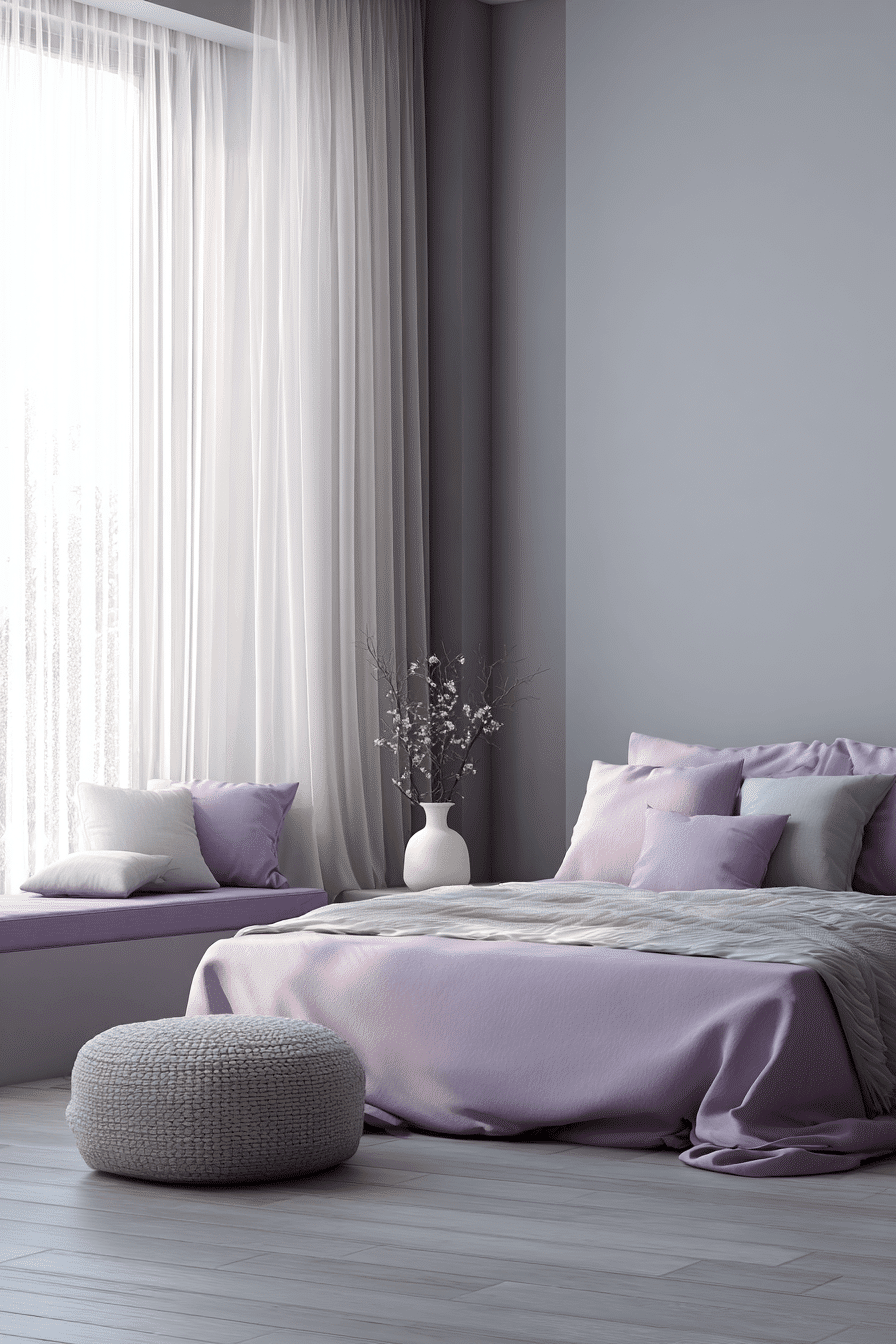 Light grey with lilac touches makes purple and grey bedroom ideas refreshing. Grey walls keep the room neutral, while lilac adds a playful softness. Plush bedding and accents elevate the look. The palette feels airy and cheerful. This works because it balances fun with refinement. Click here to find more lilac and grey bedroom inspirations.